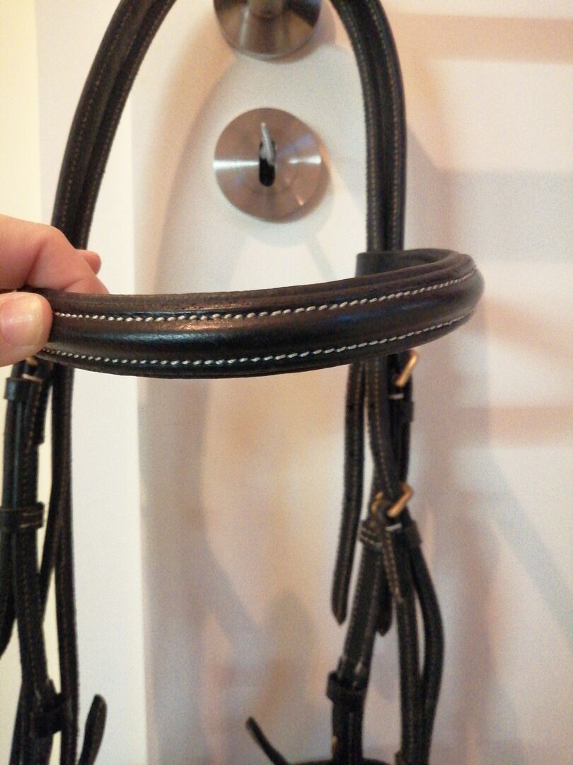 Snaffle VB-English Caveson - Z powodu zmniejszania się mojej stajennej szafy, mam do zaoferowania dwa używane, piękne konkursowe snaffle. Angielski pasek na nos z pasującymi sznurami. Biały haft, patrz zdjęcie.