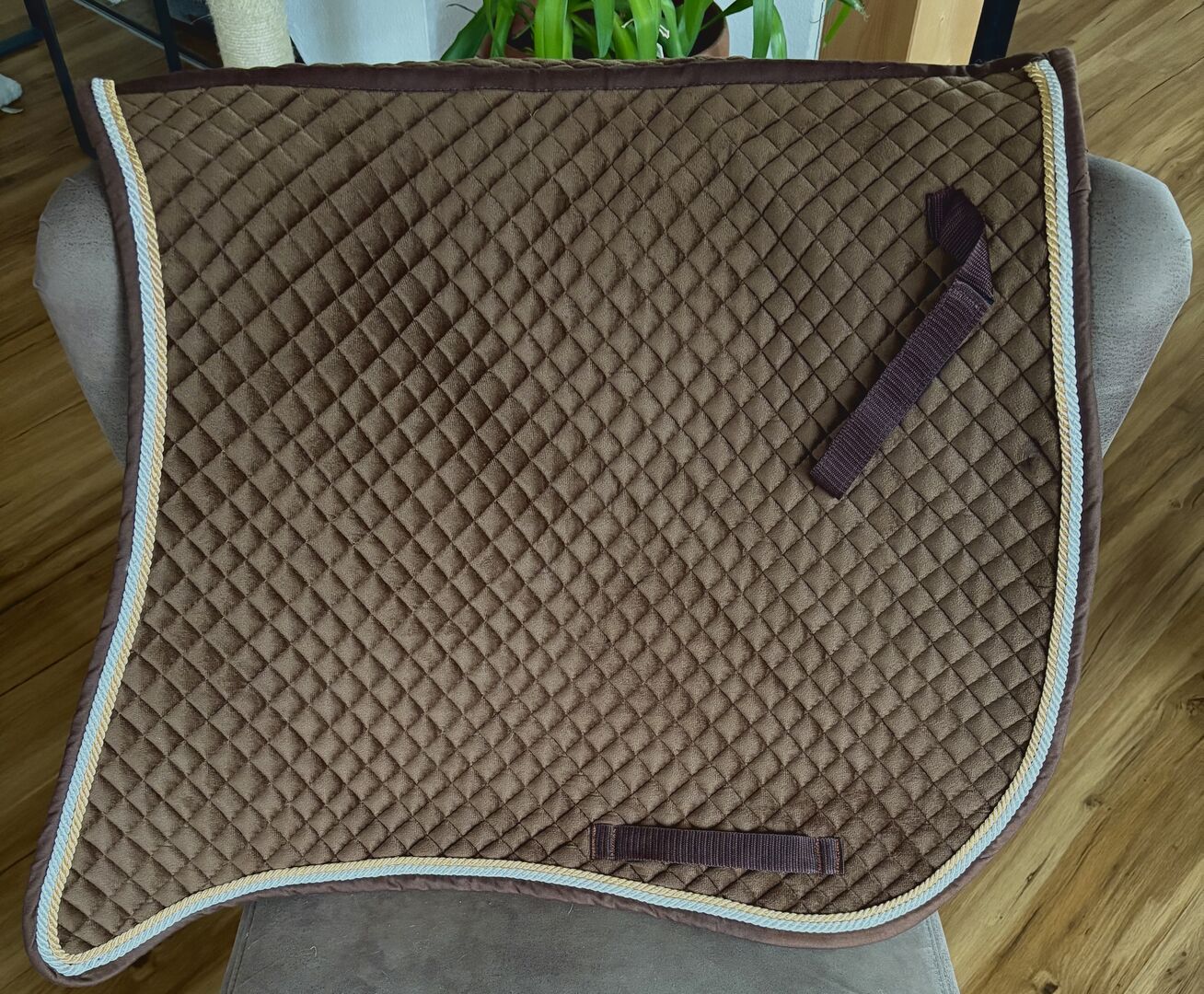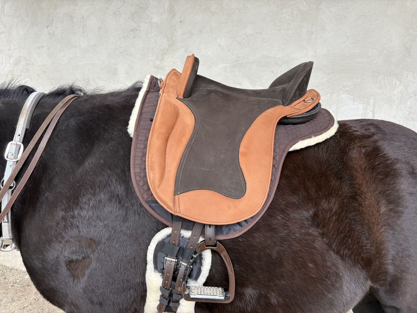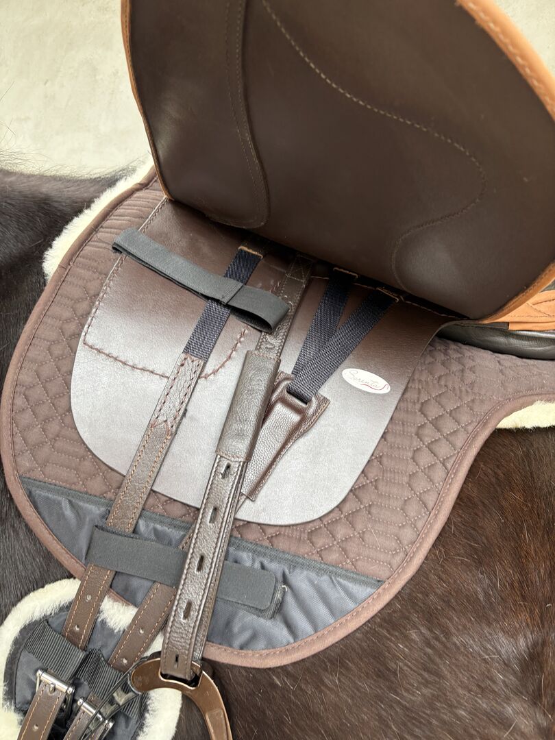 - Kolor ciemnobrązowy - camel (kolor nie jest czarny, zdjęcia trochę przekłamują) - Siedzisko 34 cm (krótki obszar kontaktu, długość ok. 49 cm) - długa klapa siodła, do pracy w jeździectwie i ujeżdżeniu - z klapą siodła - Skóra: zamsz połączony ze skórą syntetyczną - Podkładka pod siodło z rzepem, regulowana - Aksamitna podkładka pod siodło, krój: barokowy brąz - beż (WB- KB)