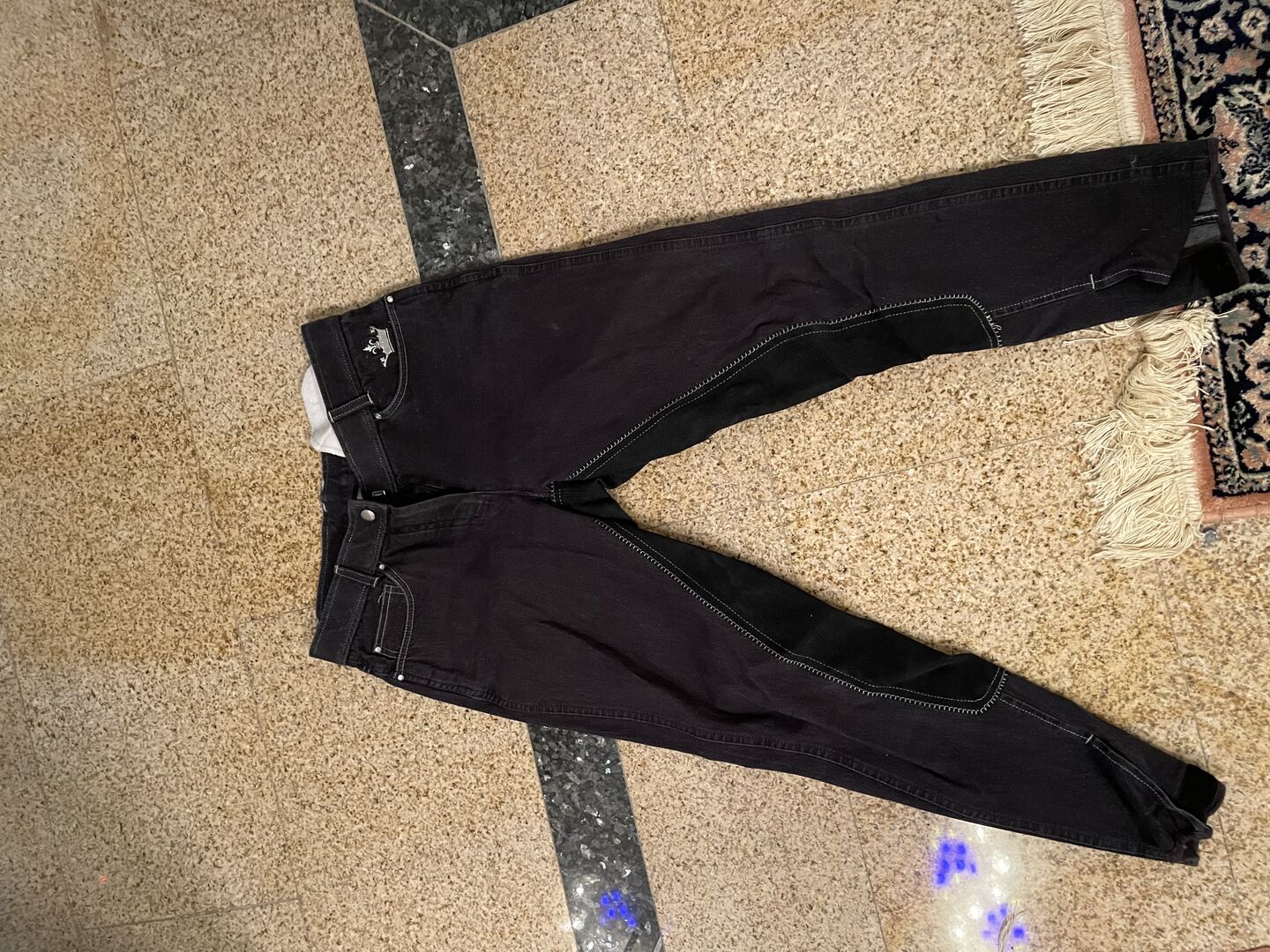 Jeansreithose und Größe 38 mit Ledervollbesatz.