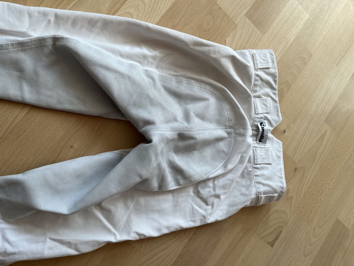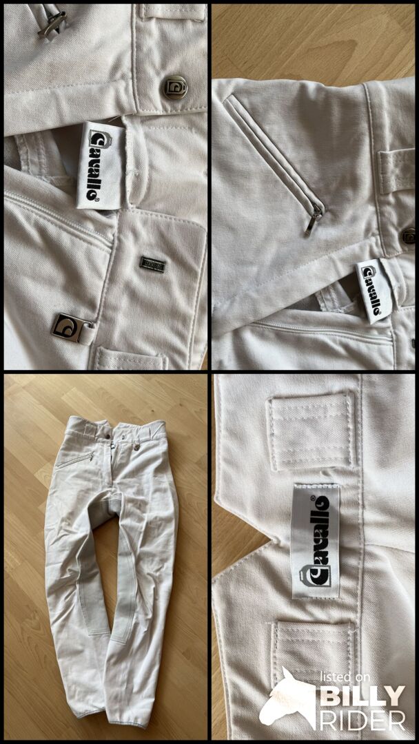Spodnie konkursowe Cavallo - Bryczesy pokazowe Cavallo w rozmiarze 36. Siedzą bardzo wysoko ze względu na wysoki krój, ale zawsze uważałem je za bardzo wygodne w noszeniu. Bryczesy nadal mają zapięcie na rzep na nogawkach. Niestety czarnych śladów zużycia na całym siedzeniu nie da się już usunąć, podobnie jak czarnej plamy pod zamkiem błyskawicznym. Spodnie kupiłem sam z drugiej ręki. Może komuś z Was się jeszcze przydadzą :)