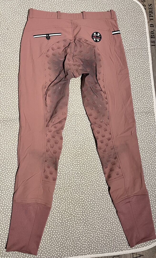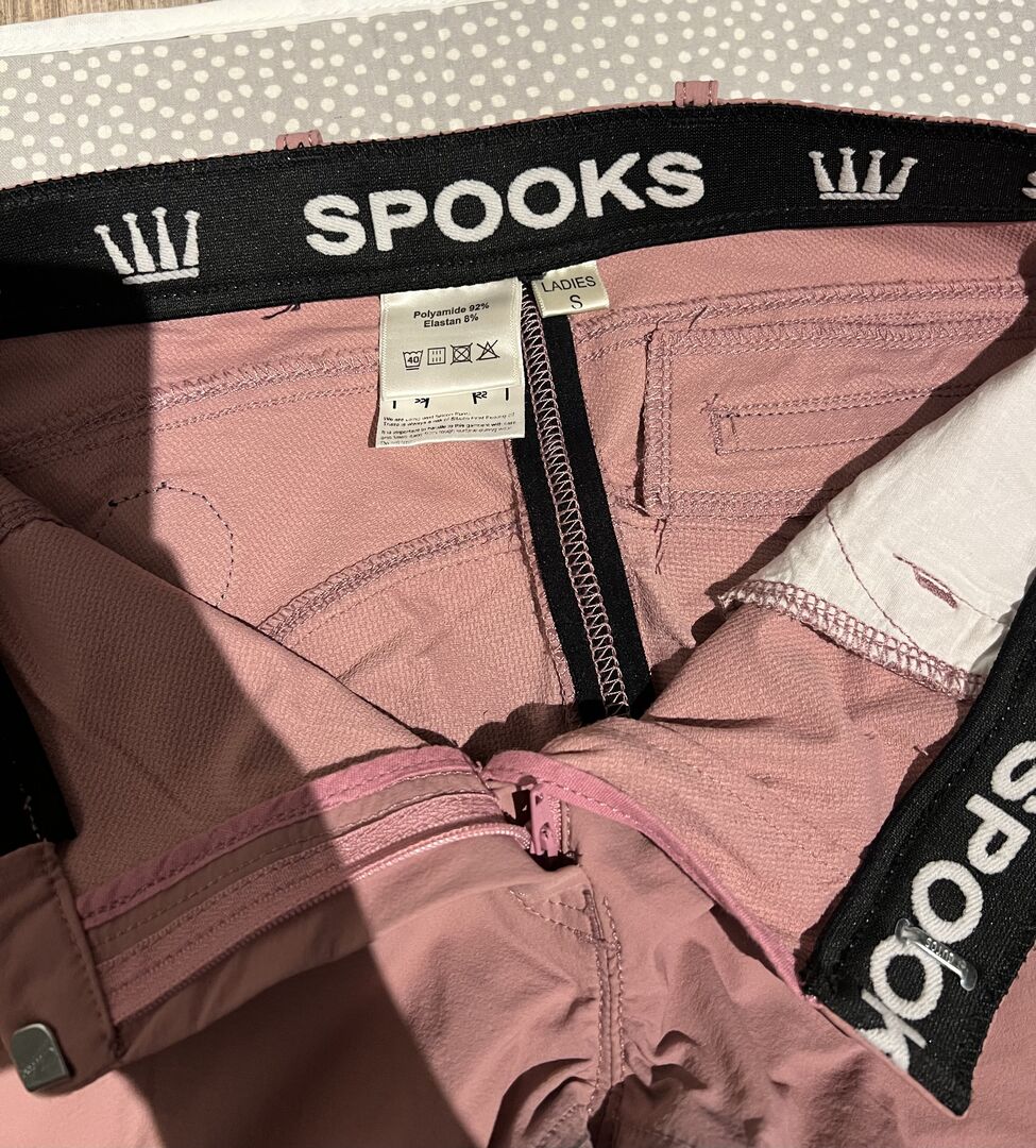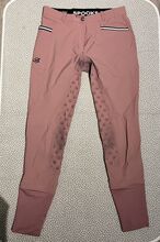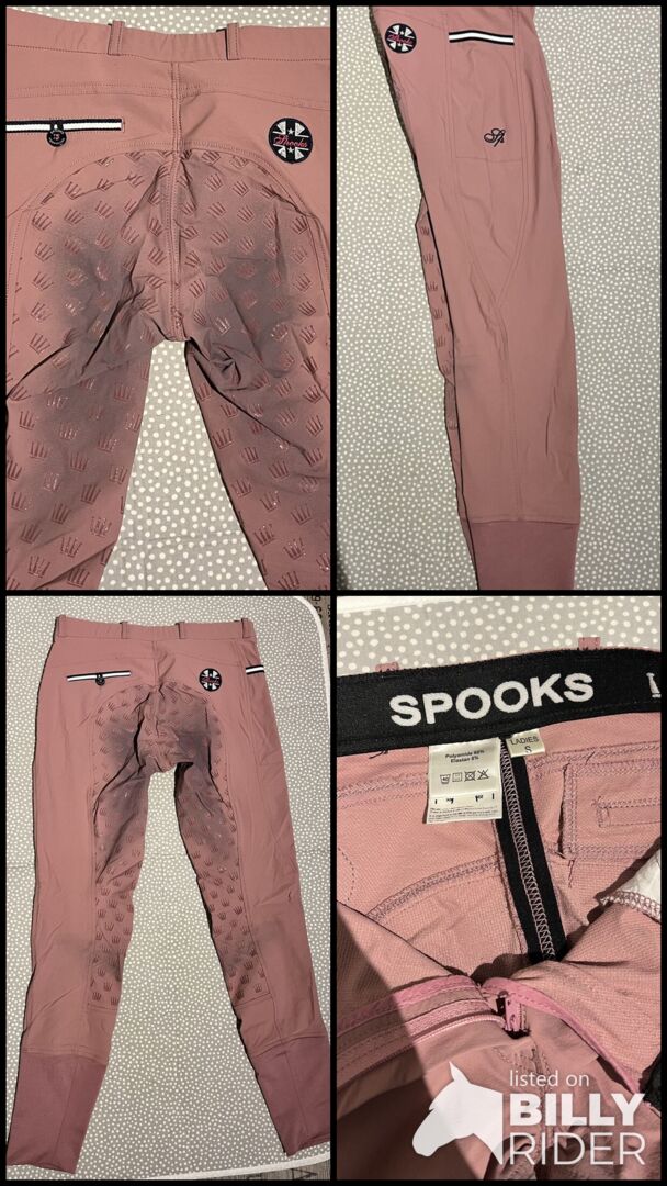Spooks bryczesy Leena jasnoróżowe rozmiar S - Bryczesy jeździeckie Spooks Leena "light" (cieńszy materiał niż model bez "light"), rozmiar S, oryginalna cena 139,90 euro. Jak widać na zdjęciach, siodło jest czarne. W przeciwnym razie nie ma większych oznak zużycia.