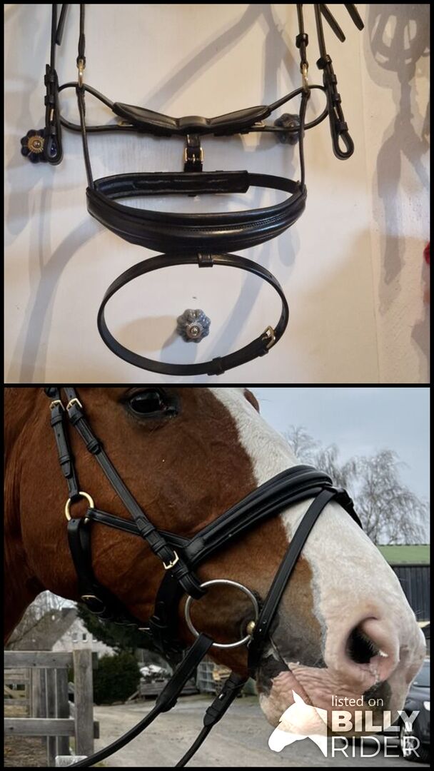 St Bridle Snaffle - Uzda na sprzedaż z fakturą Czarny ze złotymi okuciami Opaska Ascot w zestawie Zakupiony 13/01/2024 Bez lejców NP 230€ Snaffle był zawsze przechowywany w torbie na snaffle. Wysyłka możliwa po przejęciu