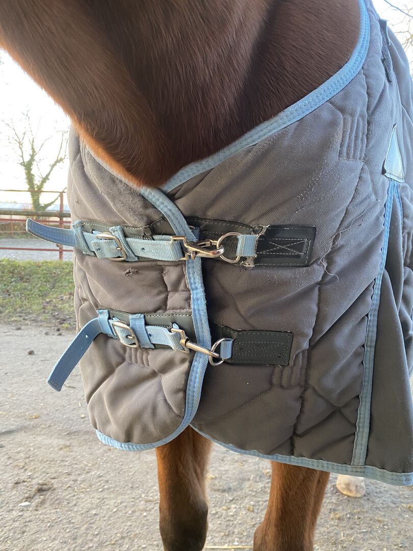 Stabilny koc Thermostar ca 145 cm - Dobrze utrzymana derka stajenna Thermostar Premium ok. 150g z Waldhausen. Koc nie jest wodoodporny. Stan - patrz zdjęcia. Koc jest tutaj na stocku VB o długości 161 cm.