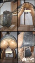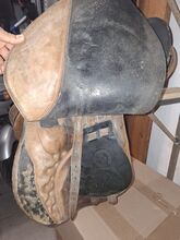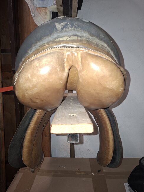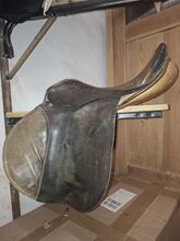 Stare siodło skokowe - Stare siodło skokowe na sprzedaż. Szerokość komory 31/32 i rozmiar siedziska 17,5, nadal w pełni funkcjonalne.