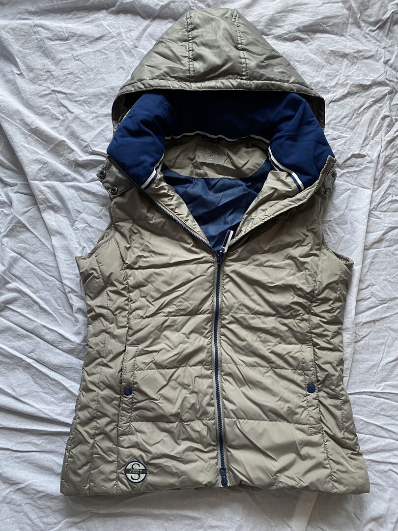 Steeds Vest Rozmiar L - Oferta kamizelki pikowanej rozmiar L kolor srebrny z niebieskim i kapturem.