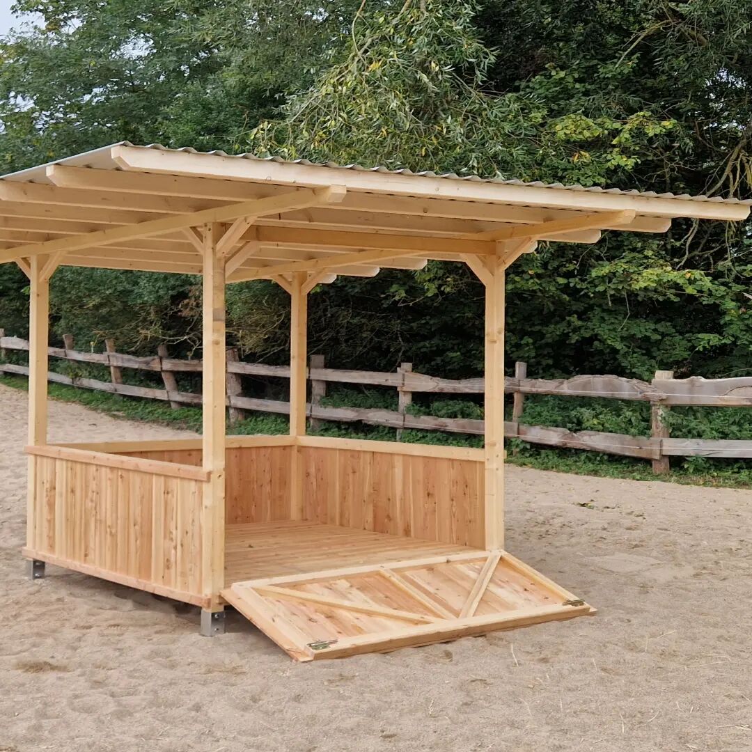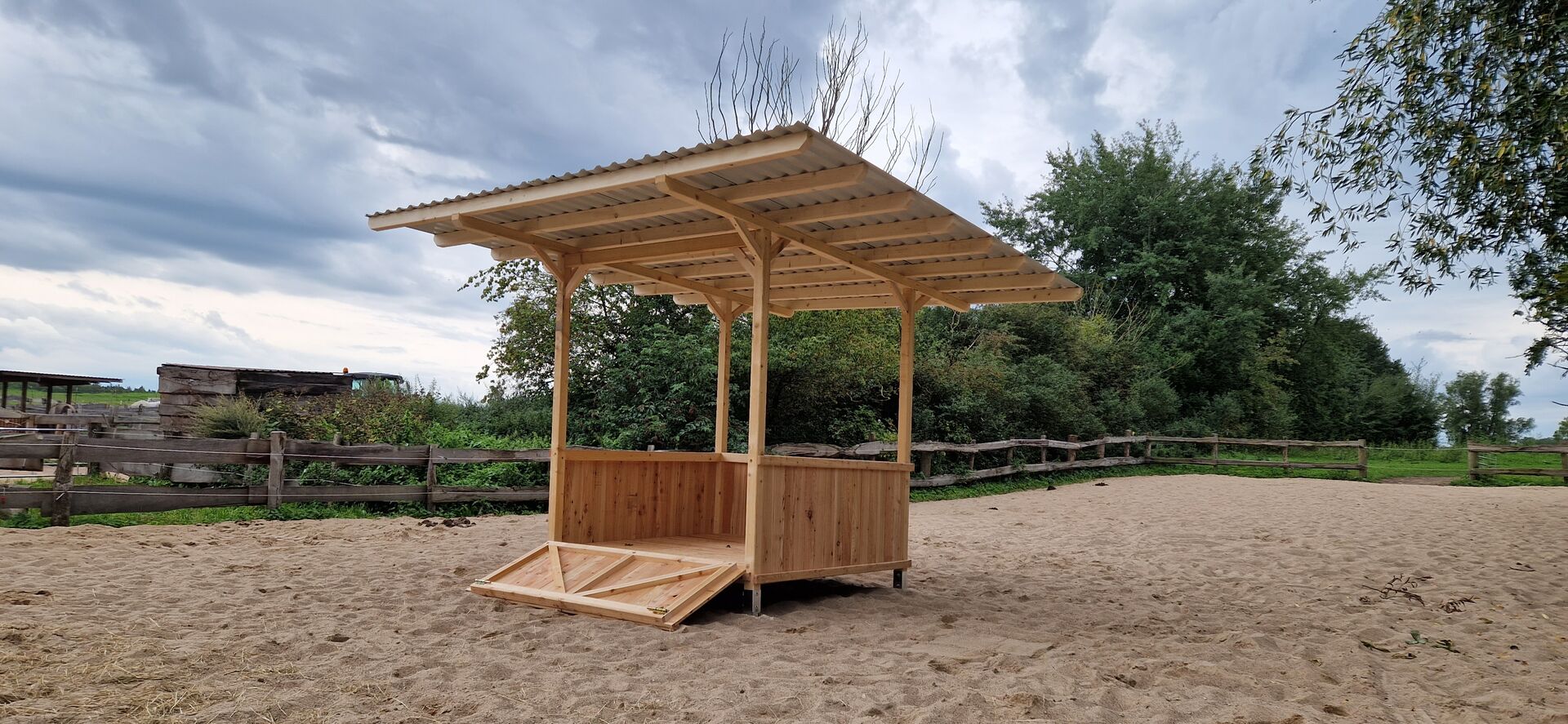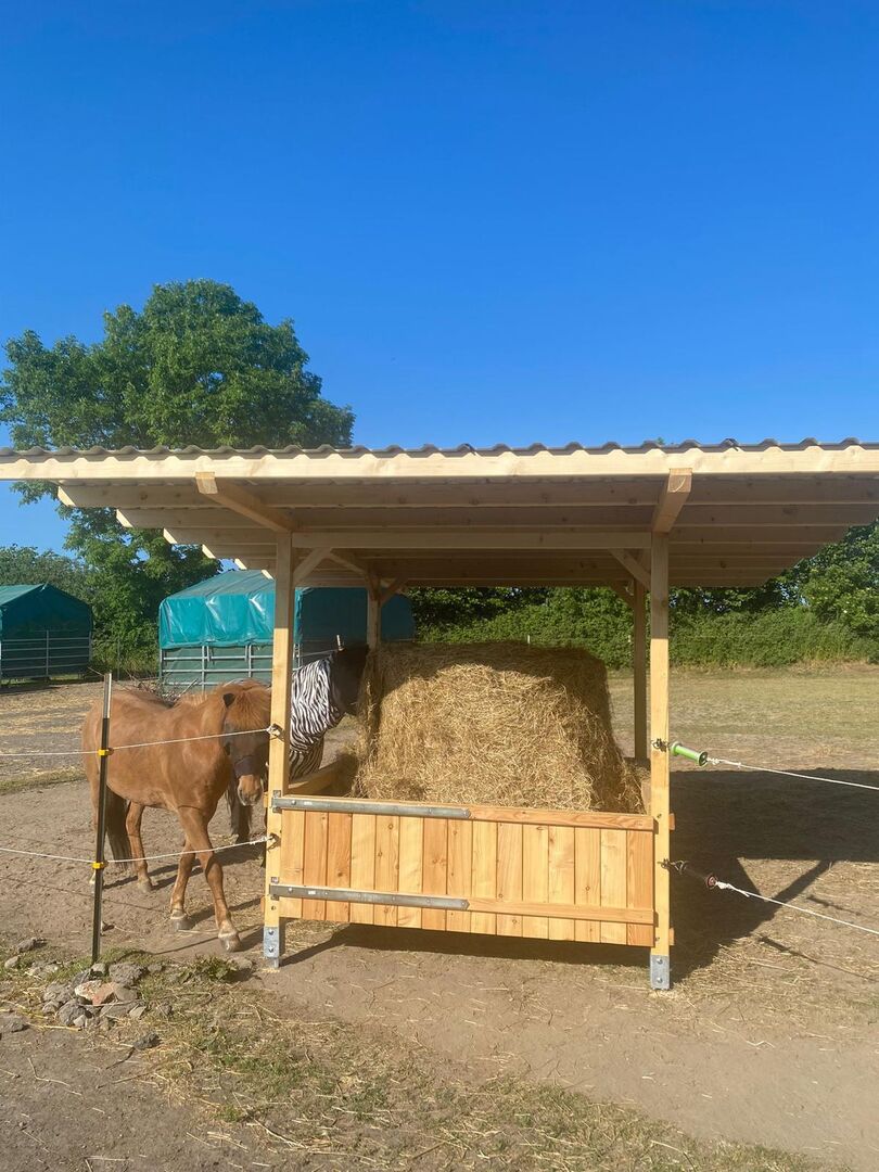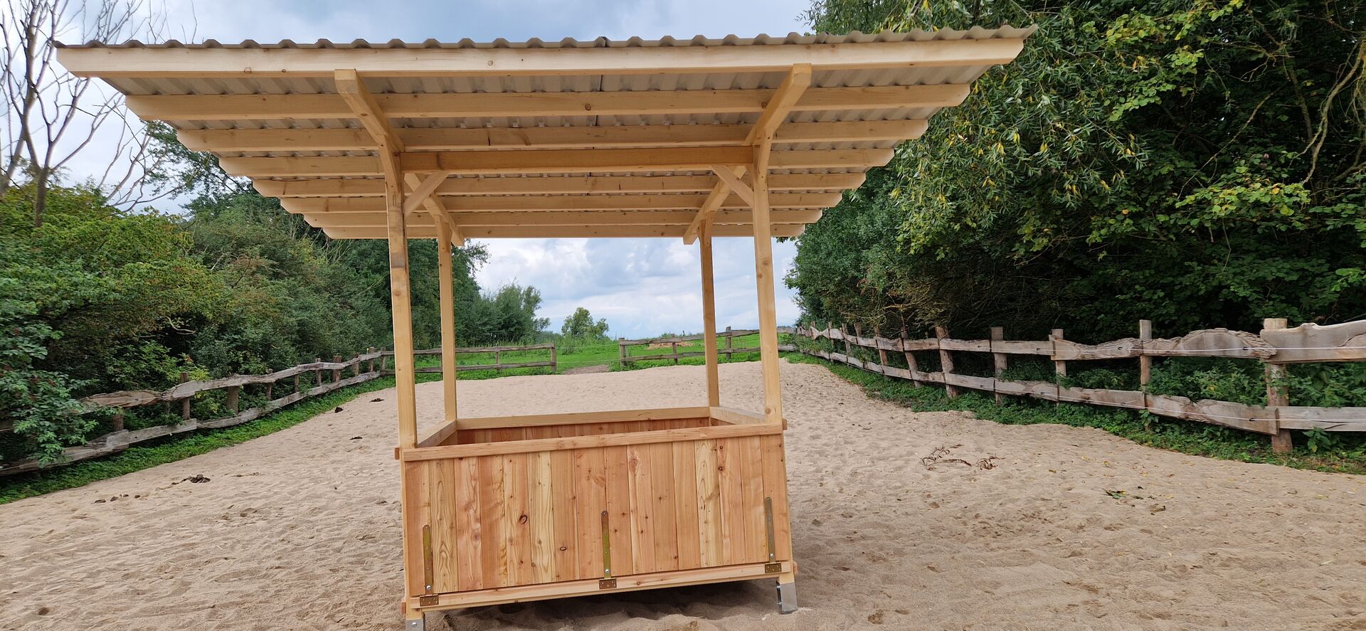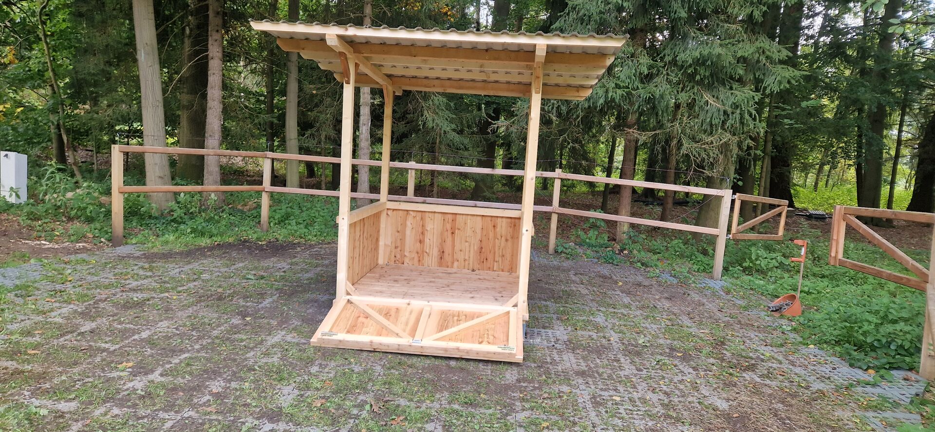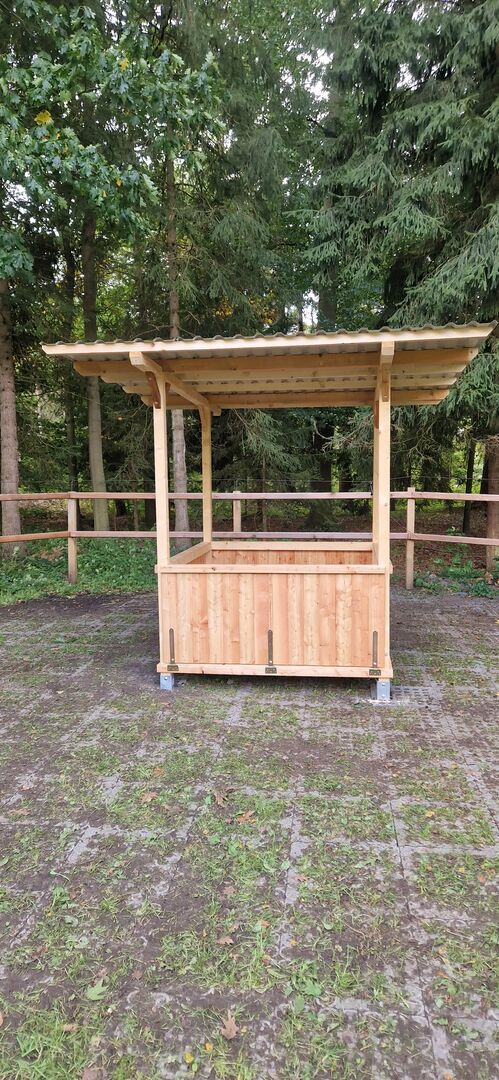 Stojaki lub skrzynia do karmienia są wstępnie zmontowane w moim warsztacie. Dach zostanie następnie zmontowany przeze mnie na miejscu przy dostawie.