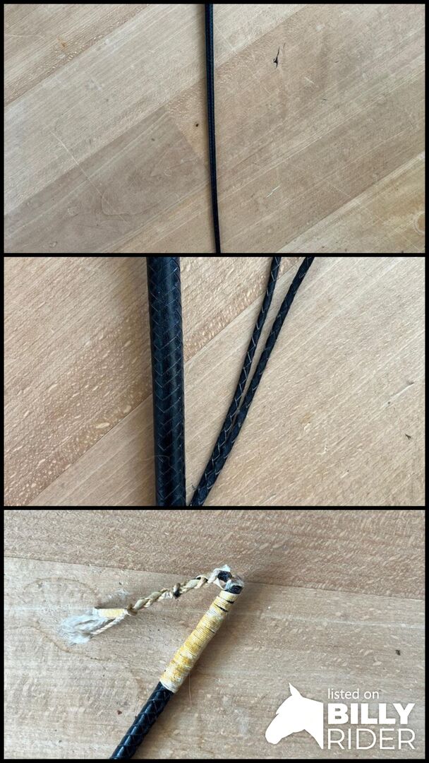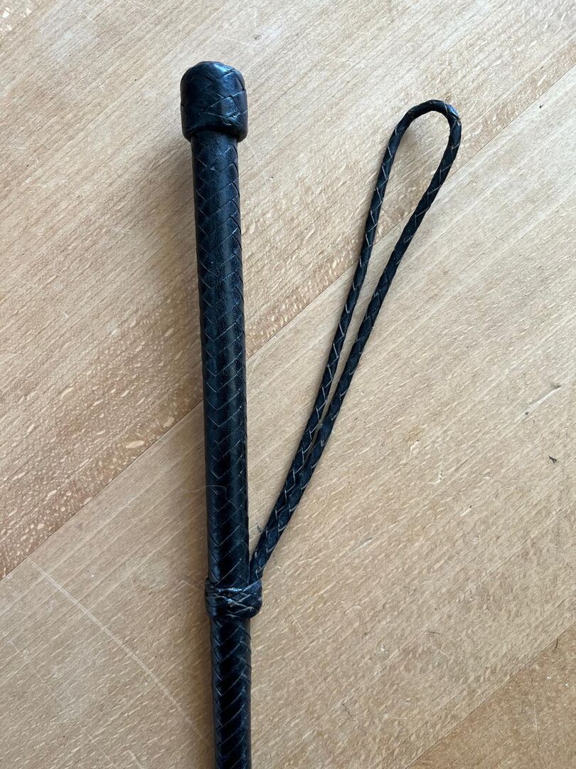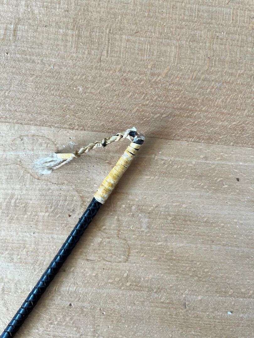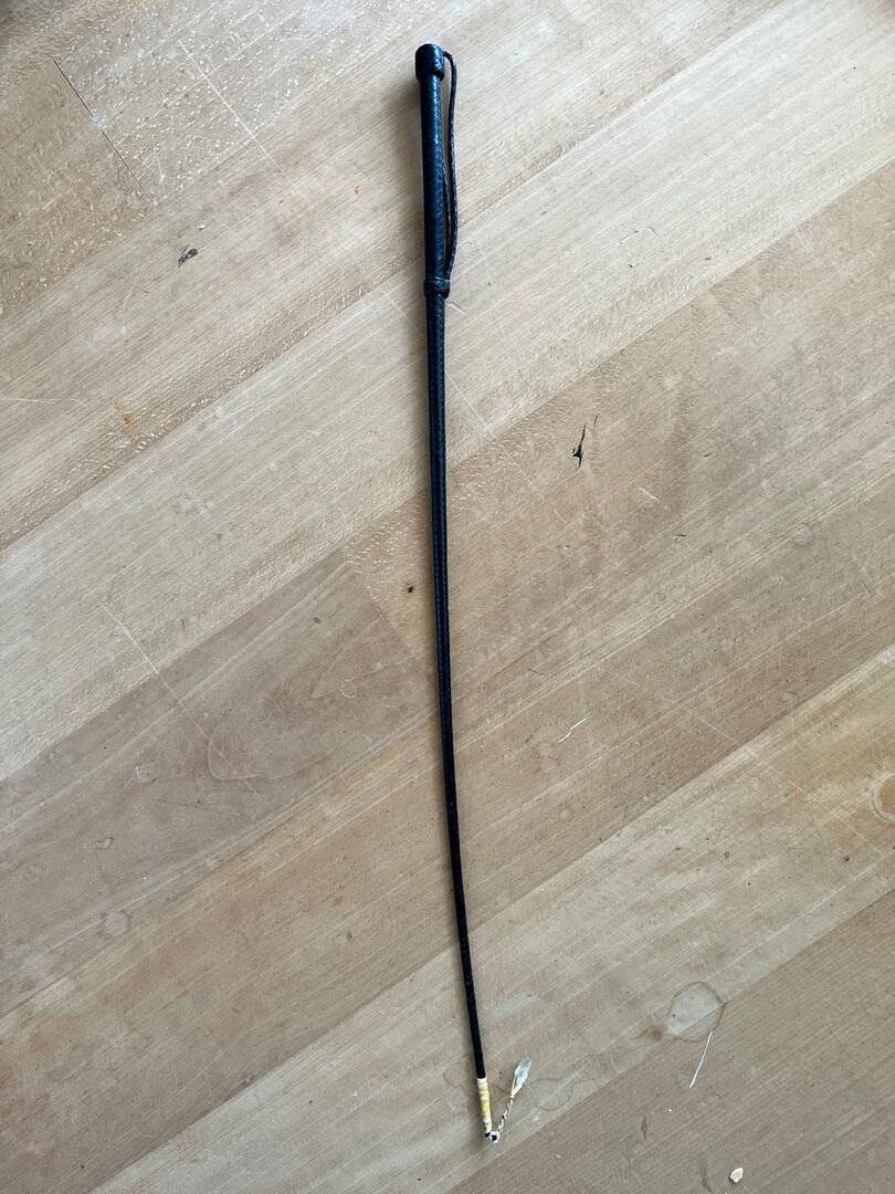 Strój jeździecki z paskiem na nadgarstek - Strój jeździecki z plecionym wzorem i ręczną pętelką długość: 85 cm w dobrym stanie, z wyjątkiem końcówki, która nieco się poluzowała, ale nadal wygląda solidnie