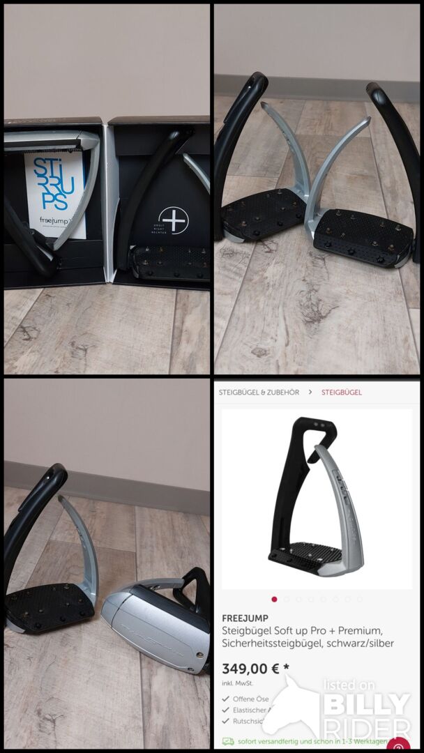 Strzemiona bezpieczeństwa Freejump Soft up pro plus, srebrne - Sprzedam srebrne strzemiona Freejump, model Soft up pro plus. Jak widać na zdjęciach, są w świetnym stanie. Na kołkach jest tylko niewielka rdza.