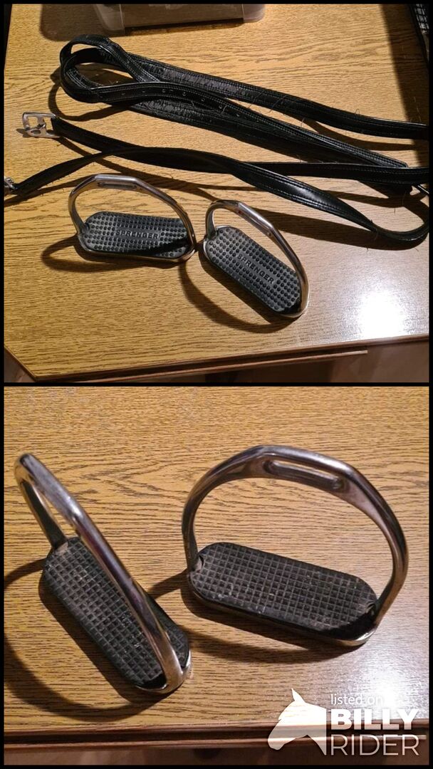 Strzemiona i skóry do strzemion - Mam do sprzedania 2 strzemiona i jedną skórę do strzemion. Wszystko jest używane, ale w dobrym stanie.