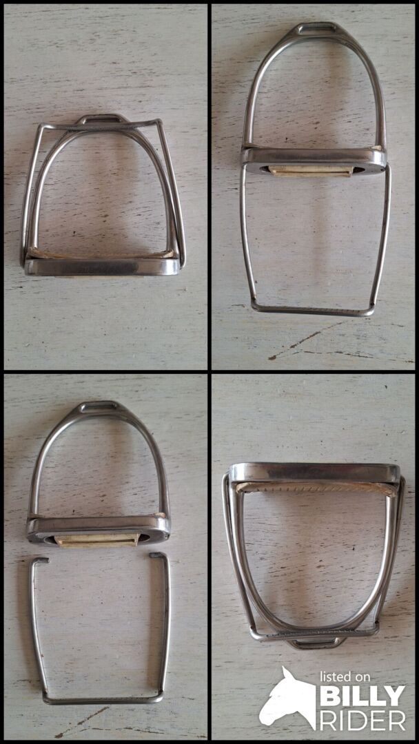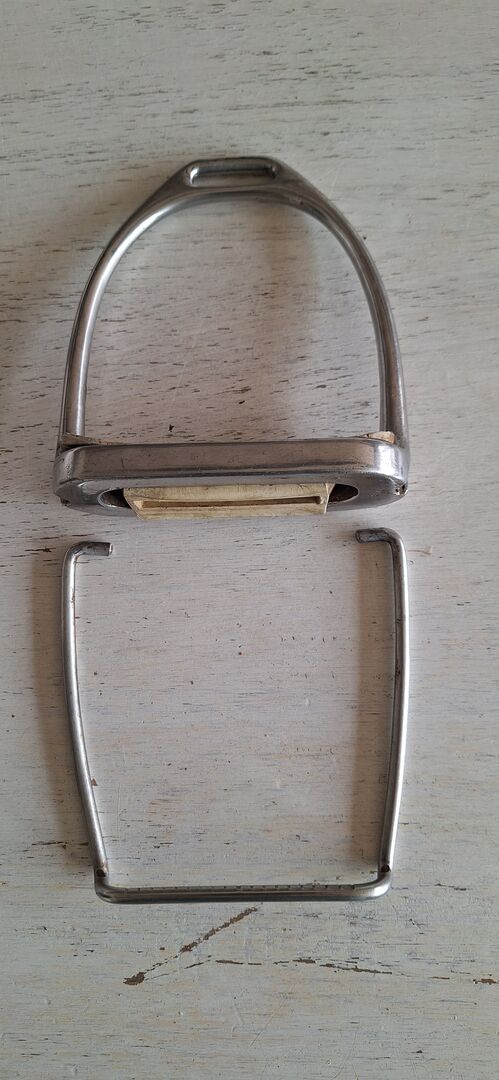 Strzemiona składane - Strzemię ze składanym strzemieniem. Wykonane ze stali nierdzewnej. Wkładka uchwytu wymaga wymiany. Patrz zdjęcie. Długość stopnia 12cm głębokość 4,4cm Sprzedaż prywatna bez gwarancji i zwrotów