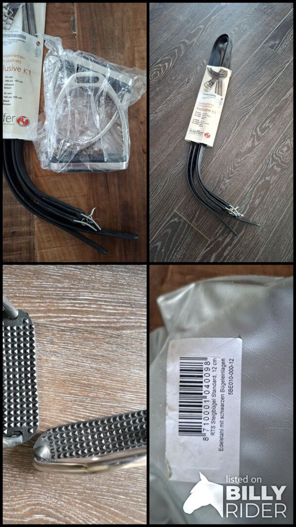 Strzemiona skórzane 155 cm i strzemiona ze stali nierdzewnej 12 cm z wkładkami do strzemion - Skórzane strzemiona Kieffer 155 cm, szerokość 25 mm Strzemiona ze stali nierdzewnej 12 cm z wkładkami do strzemion