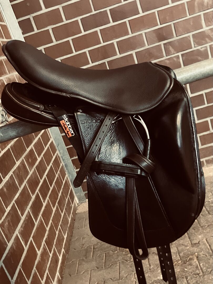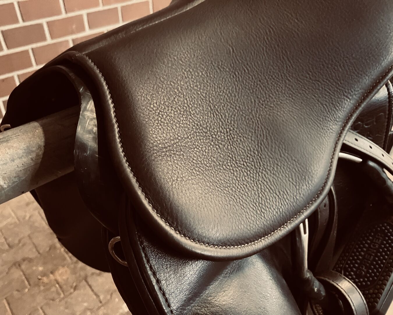 Stübben REV siodło ujeżdżeniowe klapa kolor heban brązowy TOP utrzymane 1,5 roku - Sprzedaję moje siodło ujeżdżeniowe Stübben REV (Martin Ryan) w eleganckim kolorze Ebony (ciemny brąz). Siodło jest z lutego 2024 roku (faktura jest dostępna), było regularnie sprawdzane i konserwowane przez Stübben + jest w bardzo dobrym, prawie nowym stanie - oczywiście bezwypadkowe.