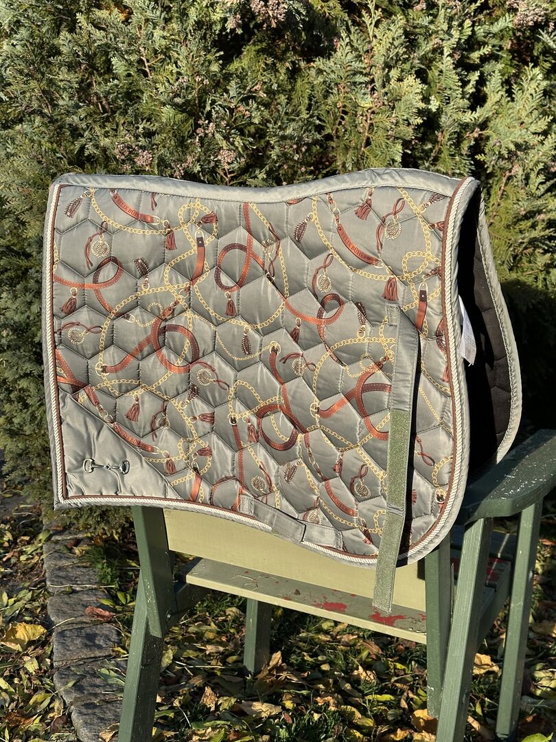 Stylowa podkładka pod siodło ujeżdżeniowe dla koni ciepłokrwistych - elegancki wzór łańcucha, najlepszy stan - Na sprzedaż elegancka podkładka pod siodło ujeżdżeniowe w rozmiarze warmblood. Podkładka pod siodło zachwyca unikalnym wzorem łańcuszków i pasków i nadaje każdemu koniowi stylowy wygląd. Idealny do użytku w sporcie ujeżdżeniowym lub dla jeźdźców, którzy cenią sobie elegancki wygląd również w życiu codziennym.