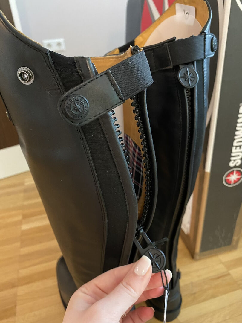 Suedwind Leather Riding Boot Dressage - Nowe i nienoszone - niestety nie pasują na moje uda. Proszę o kontakt, jeśli potrzebujesz dokładnych wymiarów ☺️ Oto kilka szczegółów - Marka: Suedwind (z Hamburga) - Kolekcja: Junior Dressage - Rozmiar: 39 (pasują również na ten model) - Bardzo lekkie - Gumowa podeszwa z dobrą przyczepnością Buty kosztowały ponad 200€, gdy były nowe. Jeśli masz jakieś pytania, skontaktuj się ze mną! :)