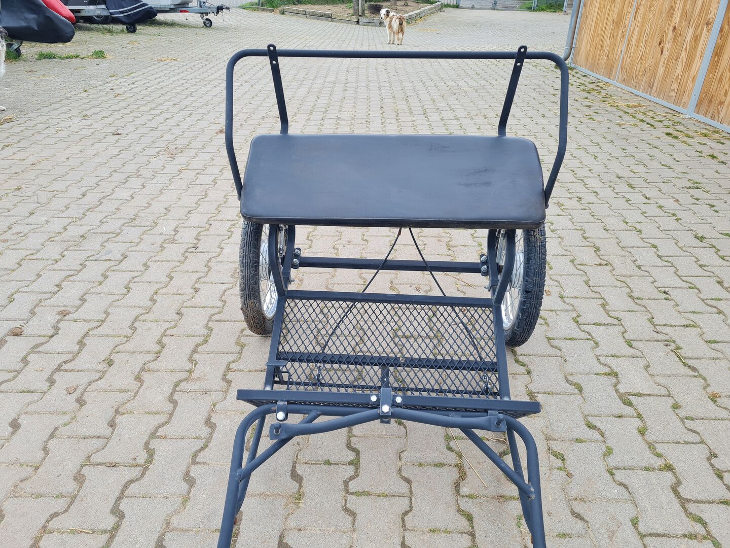 Sulky/Gig for Pony - Sprzedaję koncert, który sam kupiłem używany, dlatego nie mogę nic powiedzieć o jego wieku. Hamulec działa, oparcie jest w trakcie re tapicerowania, więc nie widać go na zdjęciach. Na widelcu z każdej strony nakleiłam taśmę, żeby go zabezpieczyć, ponieważ pod spodem są główki śrubek, a mój kucyk lubił się przy tym obcierać. Nie ma więc żadnych szkód. Opony również są jak nowe. Widać jednak ślady użytkowania i jedna czy dwie śruby zaczęły rdzewieć.