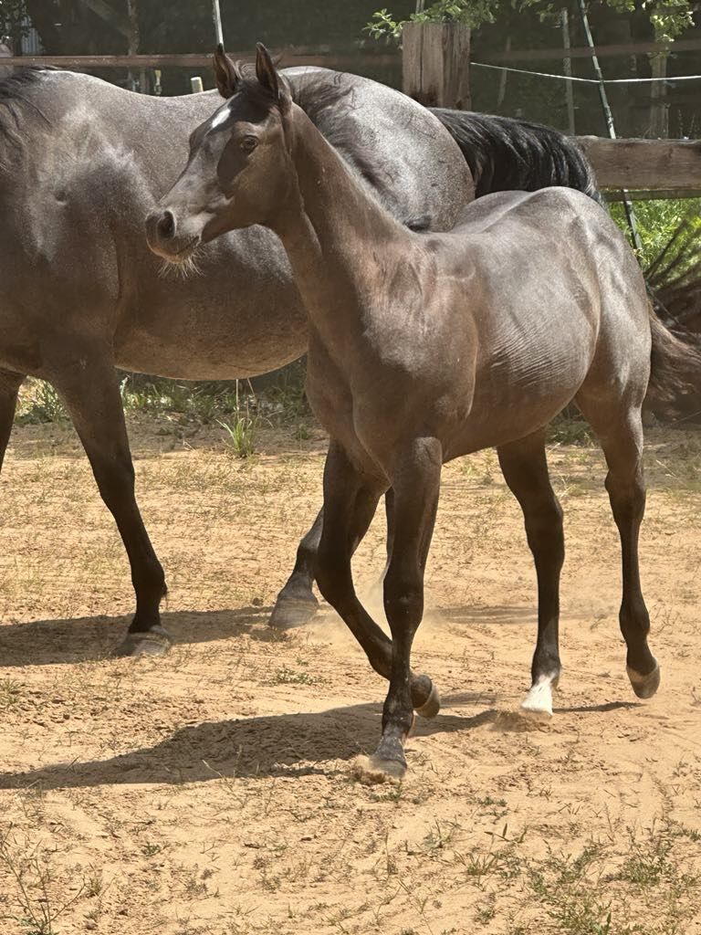 Iconic Vespa - wyjątkowo piękna klacz rasy Quarter Horse, urodzona 09.03.2025, w rzadkim i poszukiwanym kolorze Blue Roan. Jest homozygotyczna pod względem czerni i nie ma agouti, co czyni ją szczególnie interesującą genetycznie. Przy szacowanym ostatecznym wzroście ok. 150 cm ma zwartą, prawidłowo zbudowaną i mocną budowę. Jej muskulatura jest doskonale rozwinięta jak na jej wiek i prezentuje się w dobrym zdrowiu. Vespa będzie dorastać w stadzie z innymi źrebakami i będzie zaznajomiona zarówno z weterynarzem, jak i kowalem do czasu jej przekazania. Jest zaszczepiona stosownie do wieku, regularnie odrobaczana i dobrze zsocjalizowana. Codzienna obsługa jest dla niej oczywistością - jest traktowana z miłością i zawsze dobrze się zachowuje, jest nieskomplikowana i zorientowana na ludzi. Jej charakter jest niezwykle czuły, przytulny i silny. Widać, że lubi się przytulać, co czyni ją prawdziwym koniem serdecznym. Ma wiele do zaoferowania pod względem ruchu: Jest utalentowanym wierzchowcem o spokojnym, kontrolowanym chodzie i pochodzi ze sprawdzonej krzyżówki Gunnera i Hancocka - kombinacji, która już wielokrotnie sprawdziła się na arenie reiningowej i wszechstronnej. Oferuje zatem najlepsze warunki do wykorzystania w sporcie, na zawodach lub jako niezawodny partner rekreacyjny z tym czymś. Iconic Vespa jest sprzedawana z papierami AQHA i paszportem konia. Nie trzeba dodawać, że zna najważniejsze podstawy źrebięcego ABC i jest gotowa na swoją przyszłą karierę. Każdy, kto szuka utalentowanego, pięknego młodego konia o silnym charakterze i doskonałym rodowodzie, znajdzie w Iconic Vespa wyjątkowego partnera.