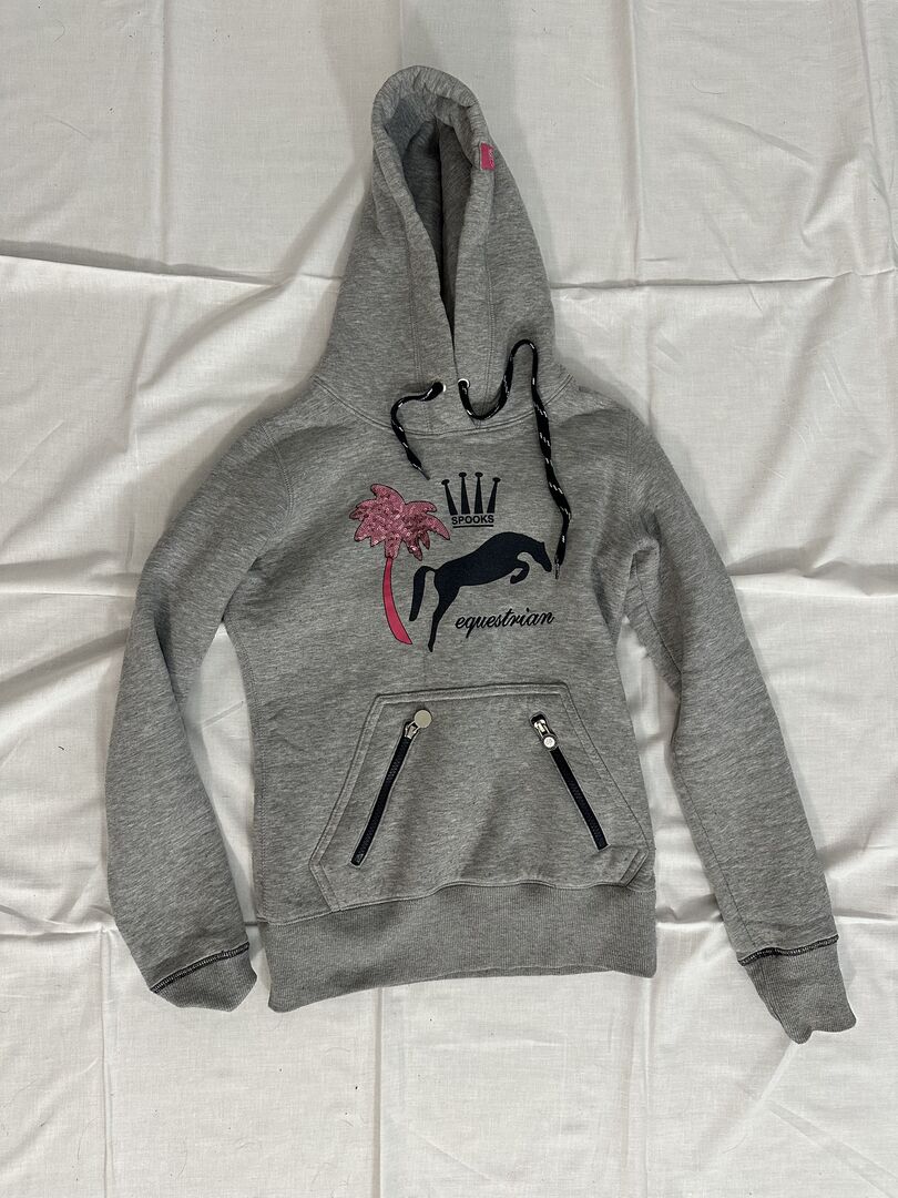 Sweter Spooks jasnoszary XS - Jasnoszary sweter od Spooks w kolorze jasnoszarym w rozmiarze XS. Saszetka z zamkami błyskawicznymi, które działają idealnie. "Różowa palma" z cekinami. Ciepły sweter z pluszowym futerkiem wewnątrz.
