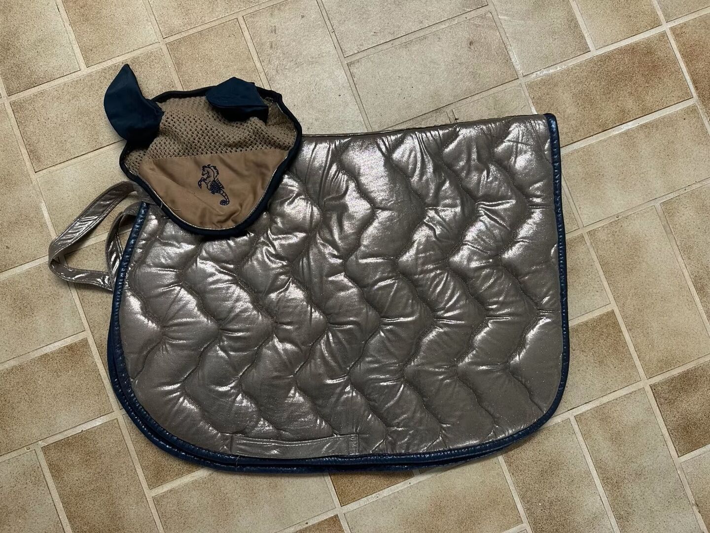 Świetna podkładka pod siodło skokowe w błyszczącym brązowym rozmiarze dla kucyków - Sprzedaję mojego bardzo dobrze zachowanego kucyka w rozmiarze podkładki pod siodło w pięknym brązowym brokacie, w tym klapki na uszy.