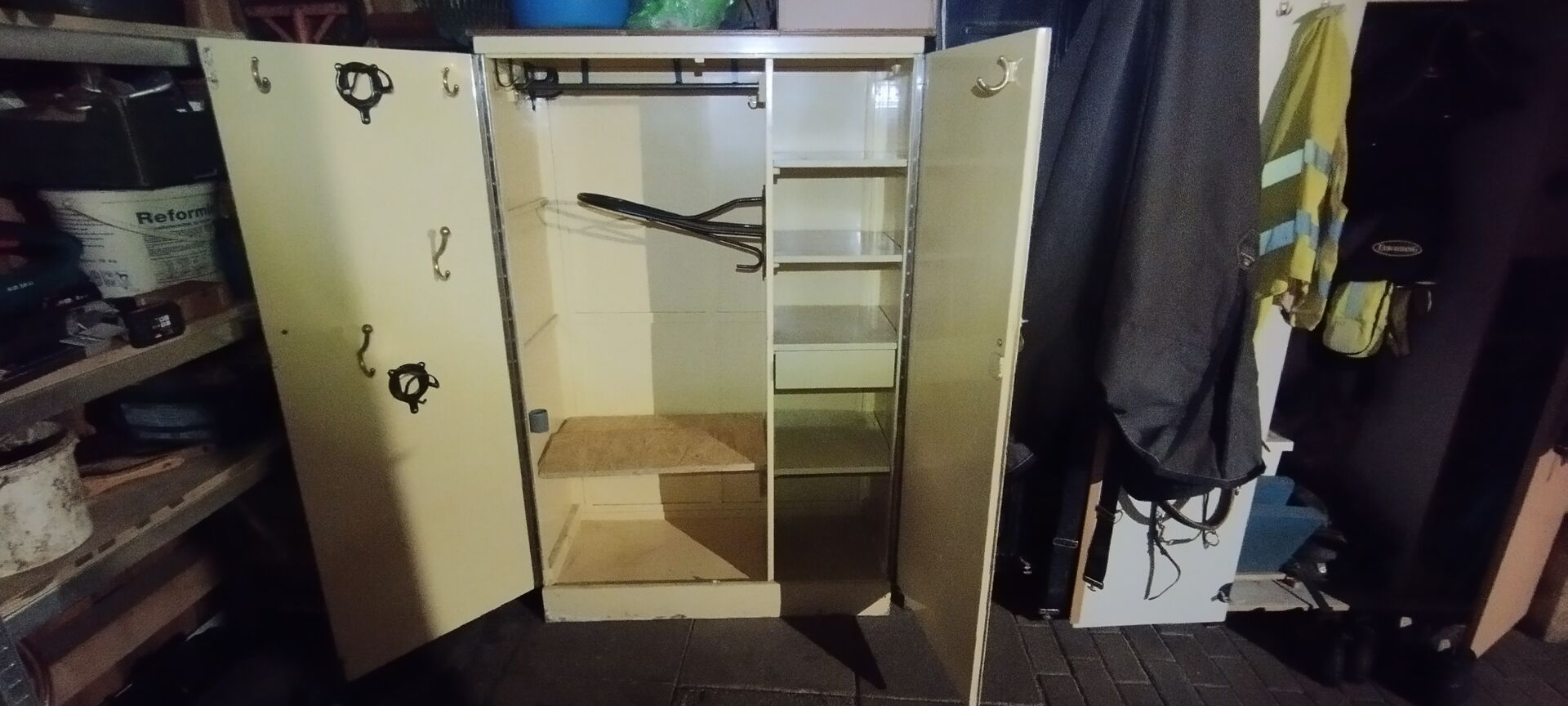Szafka na siodło, szafka, szafka, szafka stajenna - Lekka szafka do użytku jako schowek na siodełko. Szafka wykonana jest z drewna, może być montowana i demontowana oraz szybko montowana ponownie za pomocą systemu wtykowego.