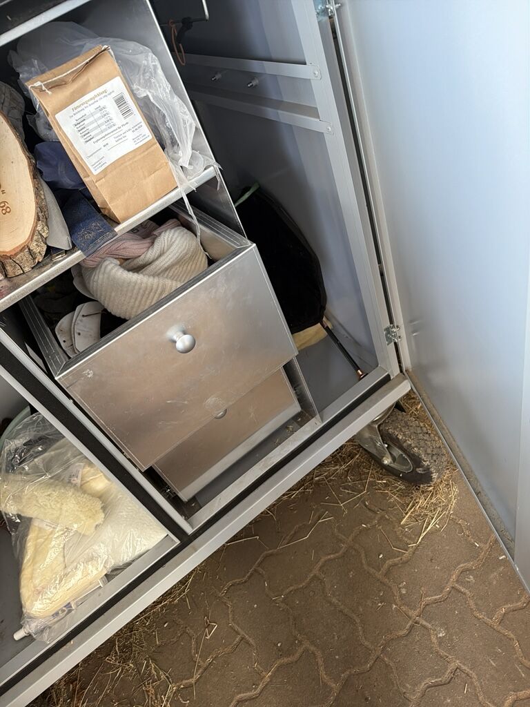 Szafka turniejowa Theurer - Sprzedaję tę szafkę wystawową. Posiada dwa regulowane uchwyty na siodła, wysuwany uchwyt na snaffle (na 3 snaffle), trzy haczyki, dwie szuflady, przegrodę i możliwość powieszenia kurtki. Szafka nie nosi prawie żadnych śladów użytkowania. Ponadto szafka ma oczko, dzięki czemu można ją automatycznie wciągnąć na duże transportery