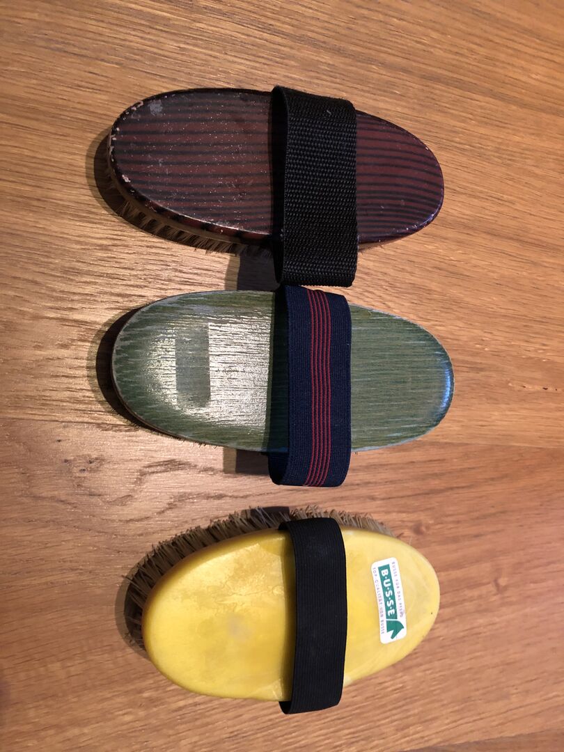Szczotki dla koni - Świeżo wyprane kardigany na sprzedaż. Ponieważ wyprałam je w pralce, kolor na brzegach jest nieco wyblakły. Są to szczotki z miękkim włosiem. (Dotyczy to tylko pędzli z brązową i zieloną kartką). Żółty pędzel został umyty ręcznie i ma twarde włosie.