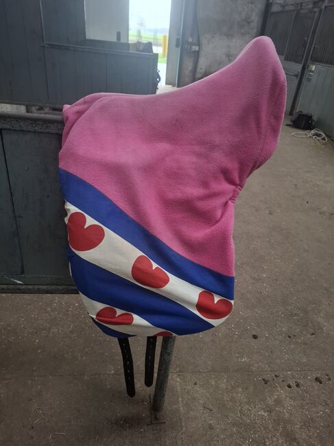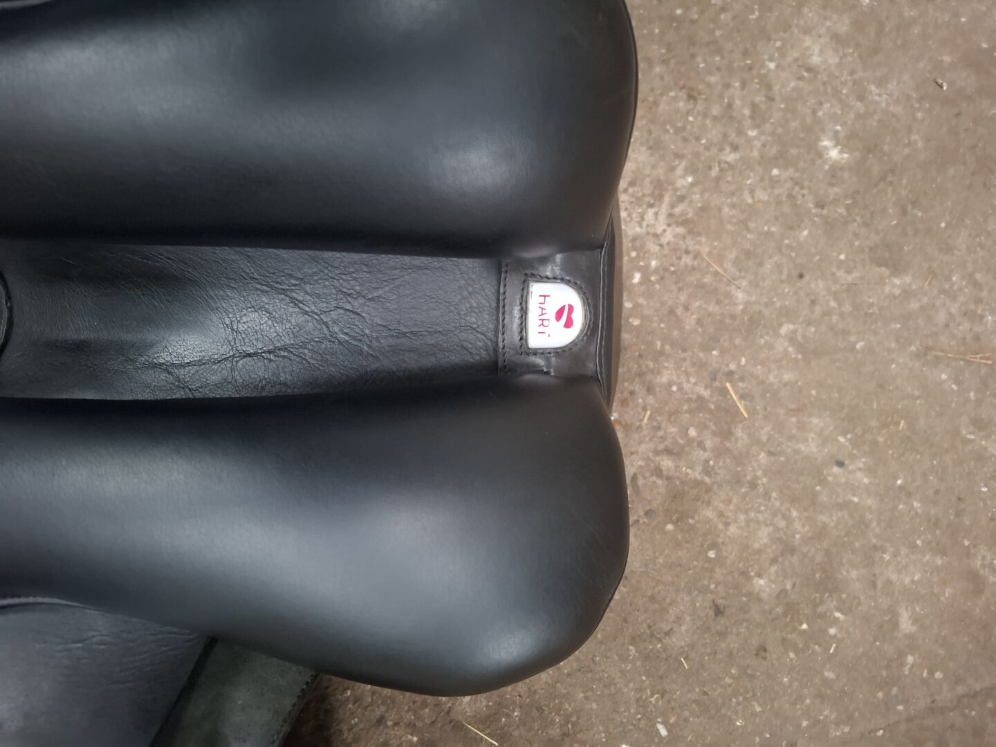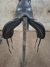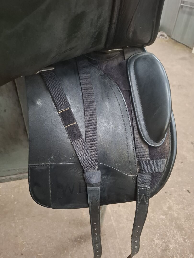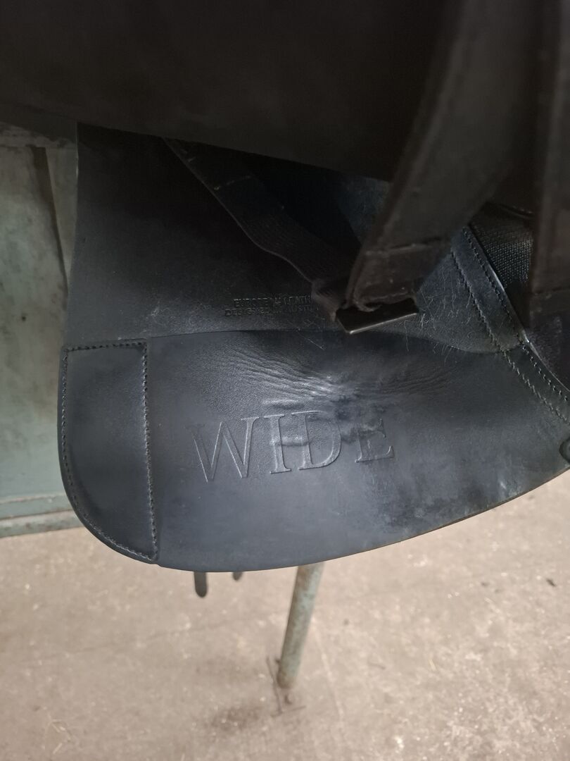 Szerokie siodło ujeżdżeniowe Bates - Piękne siodło ujeżdżeniowe Bates Wide 17 cali. Teraz ma w sobie drzewo MW. Niestety siodło nie pasuje już na mojego konia. Siodło było używane na koniu fryzyjskim o okrągłych żebrach i krótkim grzbiecie. Siodło zawsze było zadbane i sprawdzane przez siodlarza. Widoczne są pewne oznaki zużycia, jak widać na zdjęciu.