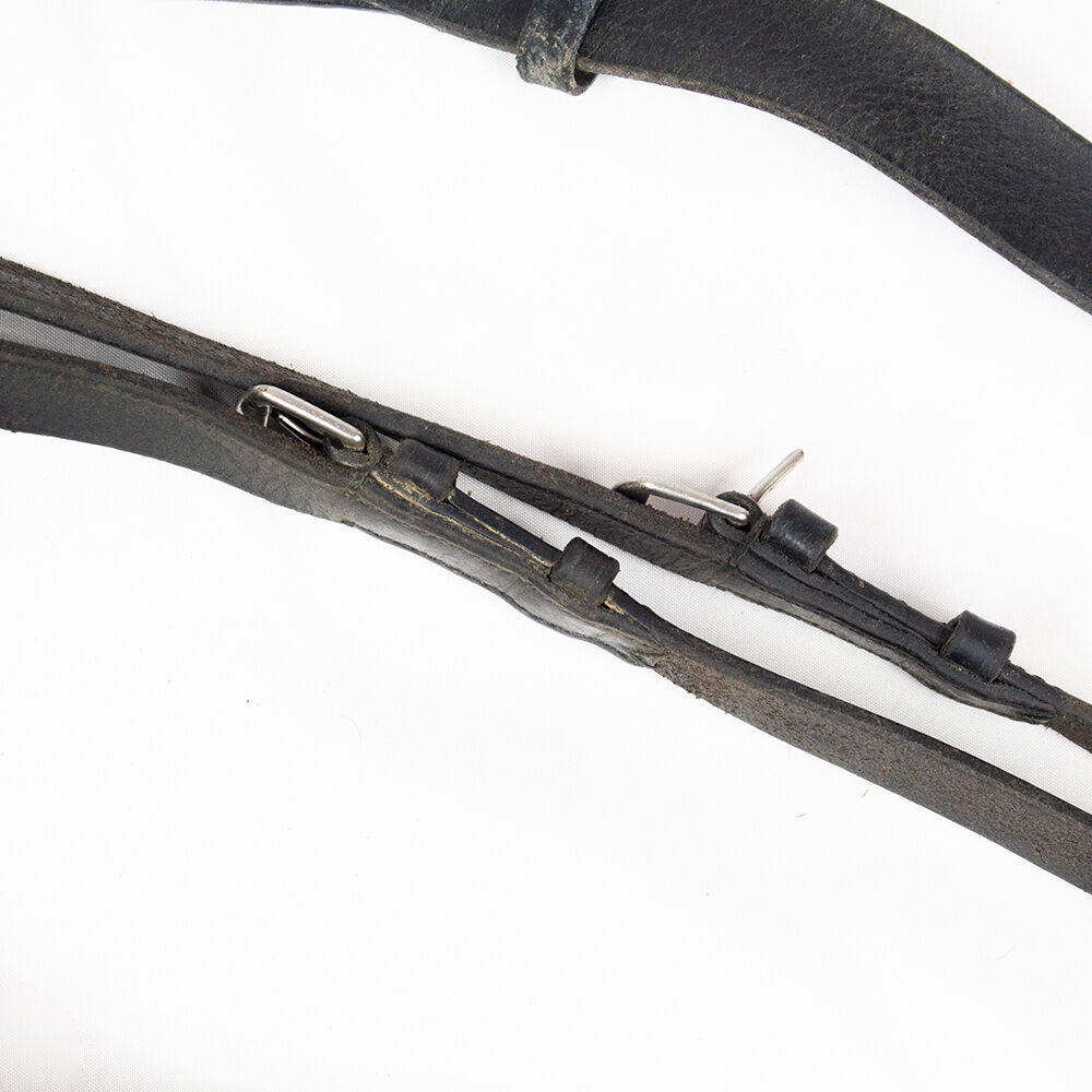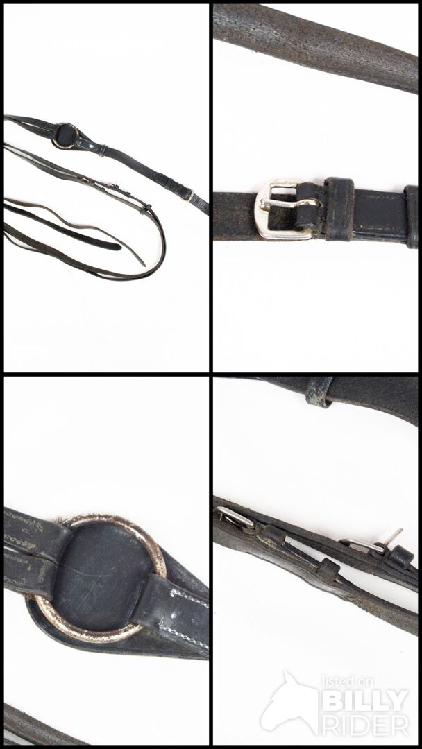 Sznurki trójkątne czarne Pełne - Te klasyczne skórzane trójkątne reiny są idealne dla początkujących i powracających jeźdźców. Można je regulować zarówno w części bazowej, jak i w bocznych ramionach, dzięki czemu pasują do wielu różnych kucyków i koni. Są one w rozmiarze Full/WB. Renifery trójkątne mają ślady użytkowania na skórze oraz rdzę na sprzączkach i metalowych okuciach. To the seller's offerlaunch