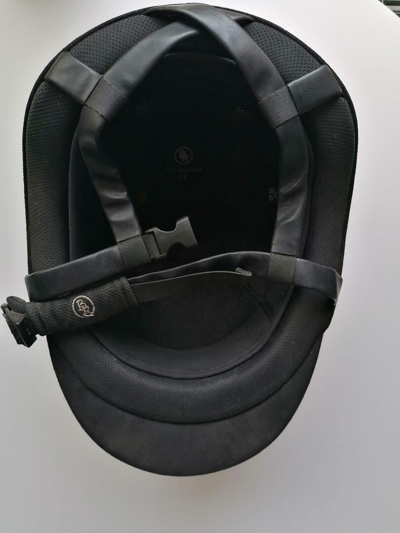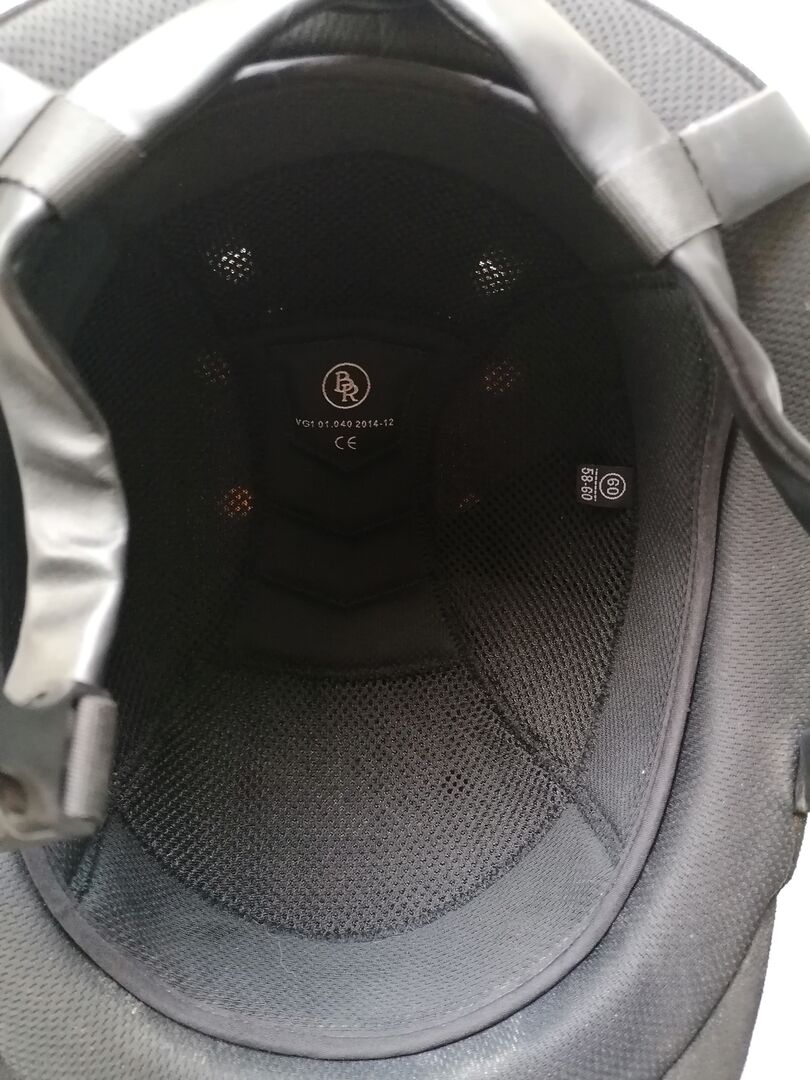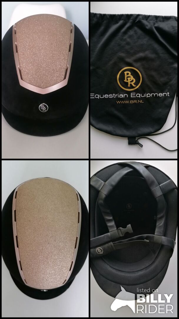 Szykowny kask jeździecki BR 58-60 L - Elegancki kask jeździecki BR ze złotym brokatem i wykończeniami w kolorze różowego złota. Stan dobry do bardzo dobrego. Rozmiar 58-60 L Bez zderzenia