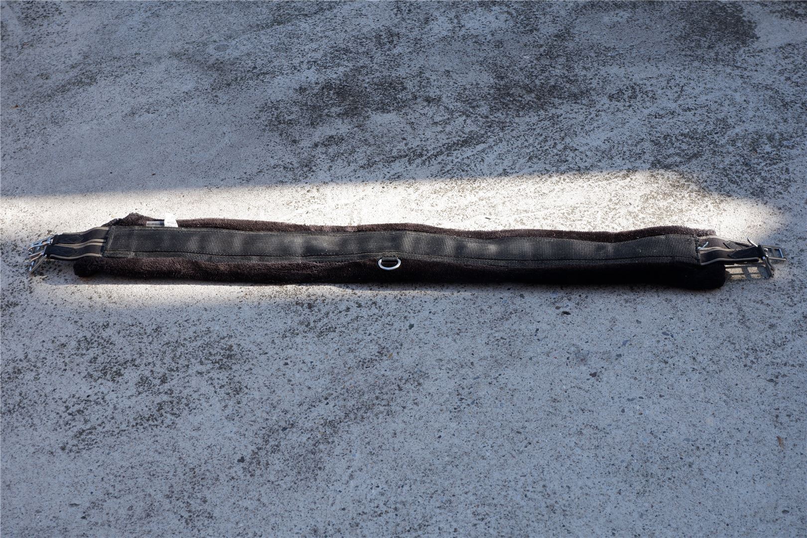 Czarny pas do siodła wykonany z polaru i nylonu, z elastycznymi wstawkami po obu stronach. Szerokość w obwodzie 14,5 cm; długość 130 cm