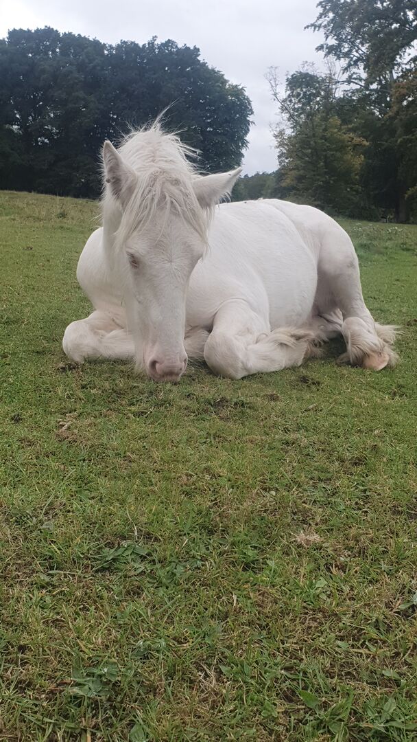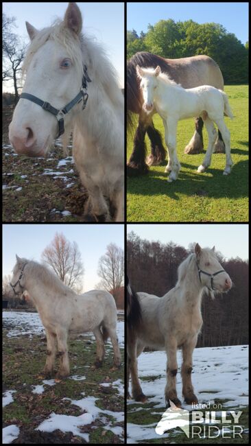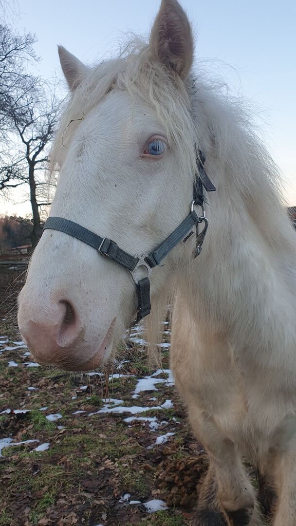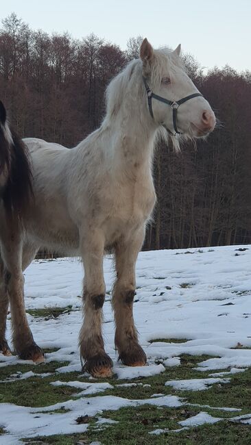 Tinker / Irish Cob , odsadek , umaszczenie specjalne - Prosimy o przeczytanie całego tekstu! Mr Nice Guy wciąż szuka wspaniałego domu z mnóstwem pieszczot i czasu. Urodził się 4.5.25, osiągnie ostateczny wzrost ok. 155 cm (obecnie ok. 133 cm), jego umaszczenie to Cremello Tobiano (test genetyczny = CR/CR, TO/n i PSSM/n). Dokumenty z rodowodem od ICS Netherlands. Będzie naprawdę silnym małym chłopcem i już jest bardzo mocno zbudowany. Będzie dorastał w naszej otwartej stajni z towarzyszami zabaw. Teraz najważniejsza rzecz, Nice Guy jest nadal trochę nieśmiały w stosunku do ludzi, to tylko z mojego powodu, nie z jego powodu! Nie miał żadnych złych doświadczeń. Chętnie opowiem więcej o tym osobiście, jeśli jesteś zainteresowany. Wie, jak się go pielęgnuje, można go dotykać wszędzie, przytulanie go przez dzieci również nie stanowi problemu, dotykanie go za kantar jest również możliwe, ale kopytowanie i prowadzenie nie jest jeszcze możliwe. Dlatego jest sprzedawany za mniej niż jest w tej chwili wart. Naprawdę potrzebuje tylko trochę czasu, niewiele pracy, ale niestety nie mam teraz czasu. Chętnie umówię się na spotkanie i poznam go osobiście.
