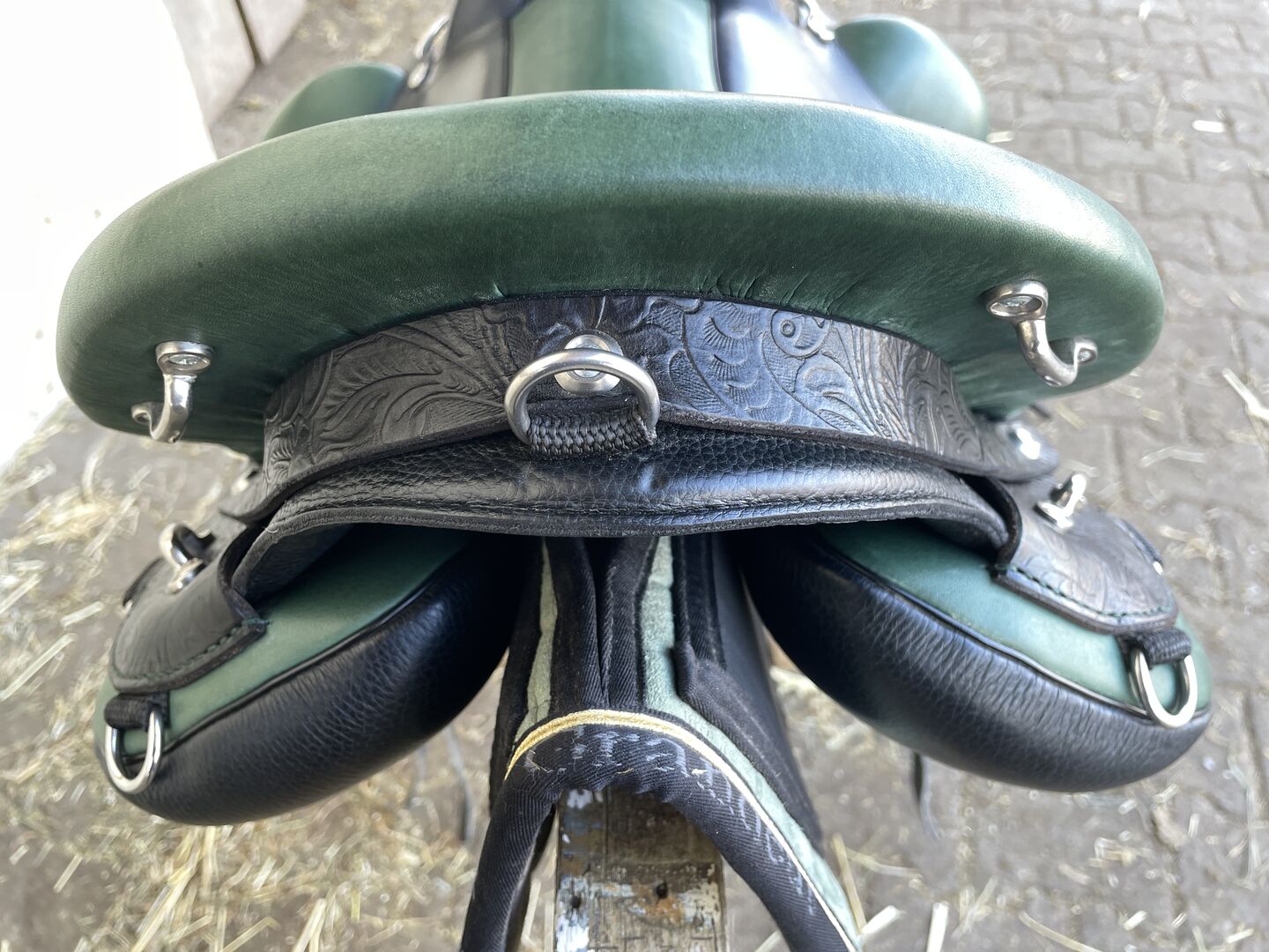 Profesjonalne siodło do jazdy wytrzymałościowej i trailowej W pełni elastyczne plastikowe drzewo z płytą wpustową - opasane Ochronne panele trekkingowe Rozmiar siedziska 18 Szerokość wpustu 31, może być regulowana bezstopniowo Powierzchnia styku: ok. 2000²cm Cechy szczególne: bardzo lekkie panele Endurance, dołączone pompki Długość poduszki: ok. 49 cm Kolor czarny - kolor specjalny zielony Srebrne okucia Skóra rosyjska Siedzisko Motion