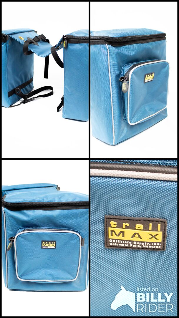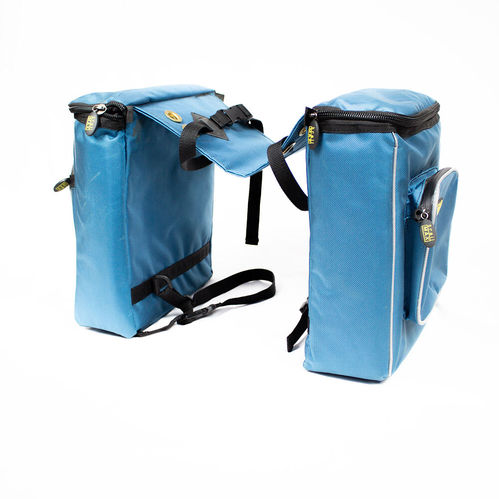 trailMAX Western Saddlebags turkusowy - Te wspaniałe zachodnie torby na siodło od trailMAX są idealnym towarzyszem na przejażdżki po szlaku lub ogólnie na przejażdżki. Torby turkusowe są stabilne wymiarowo, a jednocześnie elastyczne. Zewnętrzna strona wykonana jest z solidnej tkaniny nylonowej, która jest szczególnie wysokiej jakości i trwała. Można je łatwo przymocować do każdego siodła westernowego. Materiał utrzymuje deszcz na zewnątrz, a torby są ocieplone od wewnątrz. Przemyślany kształt równomiernie rozkłada ciężar i nawet przy dzikim galopie torby leżą spokojnie na koniu, nie latając po nim. Główna komora jest wystarczająco duża na prowiant, apteczkę lub inne rzeczy potrzebne w ciągu dnia. Posiada również małą kieszeń na zewnątrz, która oferuje dalsze miejsce do przechowywania. Oprócz wodoodpornego materiału, zamki błyskawiczne są również odporne na deszcz. Kieszenie mają po ok. 34 cm x 34 cm x 12 cm. System worków jest w bardzo dobrym stanie, posiada jedynie miejscami lekkie odbarwienia. To the seller's offerlaunch