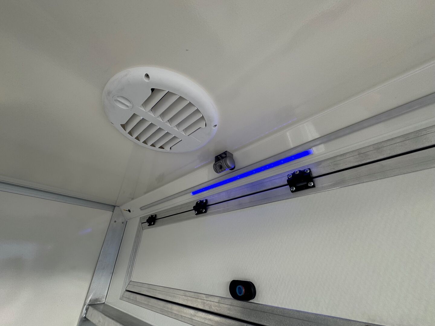 Rampa boczna z dużą otwieraną klapą powyżej, duża klapa wentylacyjna na "gorące dni turniejowe", które z pewnością nadejdą ponownie w tym sezonie. Deska na rampie, ścianka działowa z mocowaniem na szyję, składana osłona przed ukąszeniami, haki na siatkę na siano, wentylator elektryczny, 2 włazy dachowe, schowek nad kabiną kierowcy, 2 drzwi wahadłowe do holu.