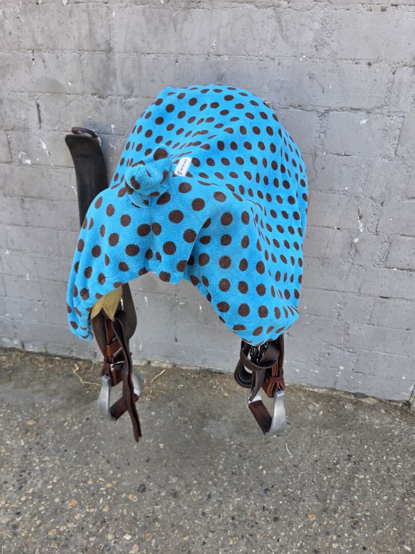 Siodło zostało zakupione w 2014 roku i zawsze było przechowywane w suchym miejscu i regularnie konserwowane. Kożuch nie jest płaski i był używany tylko z podkładką. Zawsze wisiało w komorze z ochraniaczem, który jest dostarczany bezpłatnie, przynajmniej na czas wysyłki. Wizualnie jest w naprawdę dobrym stanie, był używany tylko ze skórzanymi bryczesami/jodhpur, więc nie ma pozostałości po silikonowych bryczesach.