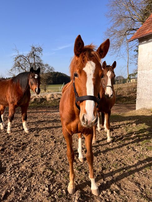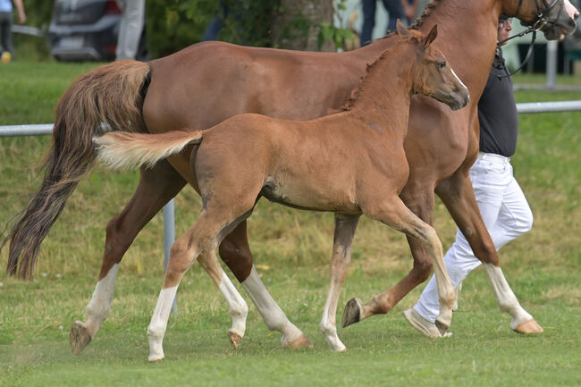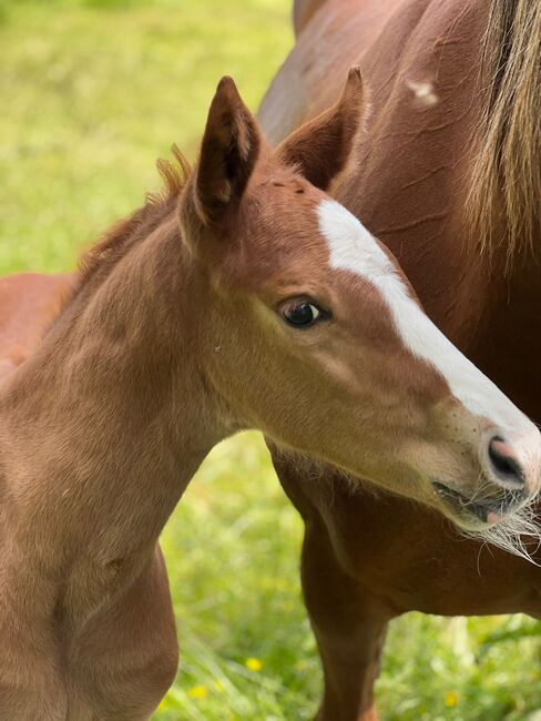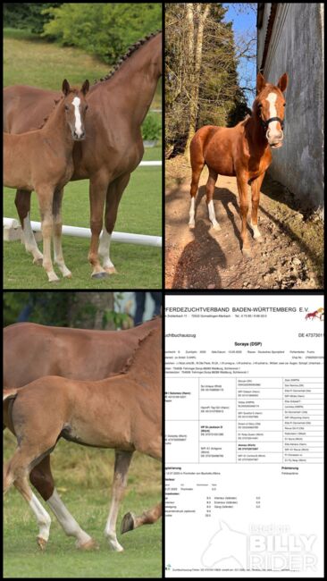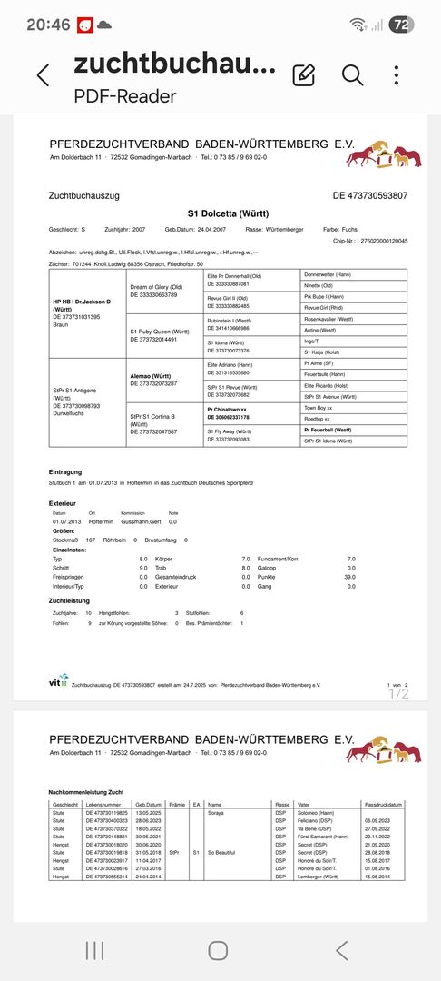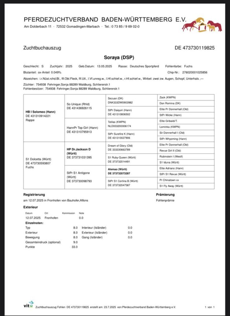 Typowa klaczka, roczna klacz, młody koń ujeżdżeniowy - Nasza klacz, urodzona 05/2025, jest na sprzedaż. Ojcem jest Solomeo, obiecujący czarny hanowerski ogier ujeżdżeniowy z Marbach State Stud. Matka Dolcetta jest po ogierze Dr Jackson D, który został uznany za jednego z ogierów o najwyższej wartości hodowlanej w ujeżdżeniu. Została wyróżniona na pokazie źrebiąt. Ma trzy świetne podstawowe chody, które można prześledzić w jej rodowodzie. Jej obecny wzrost w kłębie wynosi 148 cm. Ma również doskonałe warunki do rozpoczęcia treningu młodych koni. Opanowała już źrebięce ABC, dobrze chodzi na kopytach i jest bardzo zorientowana na ludzi. Opanowała również przycinanie kopyt bezbłędnie. Nasza klacz żyje w mieszanym stadzie i dlatego jest dobrze zsocjalizowana. Codziennie od rana do wieczora jest wypuszczana na padok, a w nocy dobrze zachowuje się w boksie. Jest klaczką bez narowów, nigdy nie chorowała ani nie miała żadnych innych urazów i była regularnie odrobaczana. Szukamy kochających, opiekuńczych rąk dla naszej klaczy, najlepiej z doświadczeniem z młodymi końmi. Dlatego wyraźnie przedkładamy miejsce nad cenę i sprzedajemy ją poniżej jej wartości (zgodnie z rodowodem). Cena podlega negocjacji.