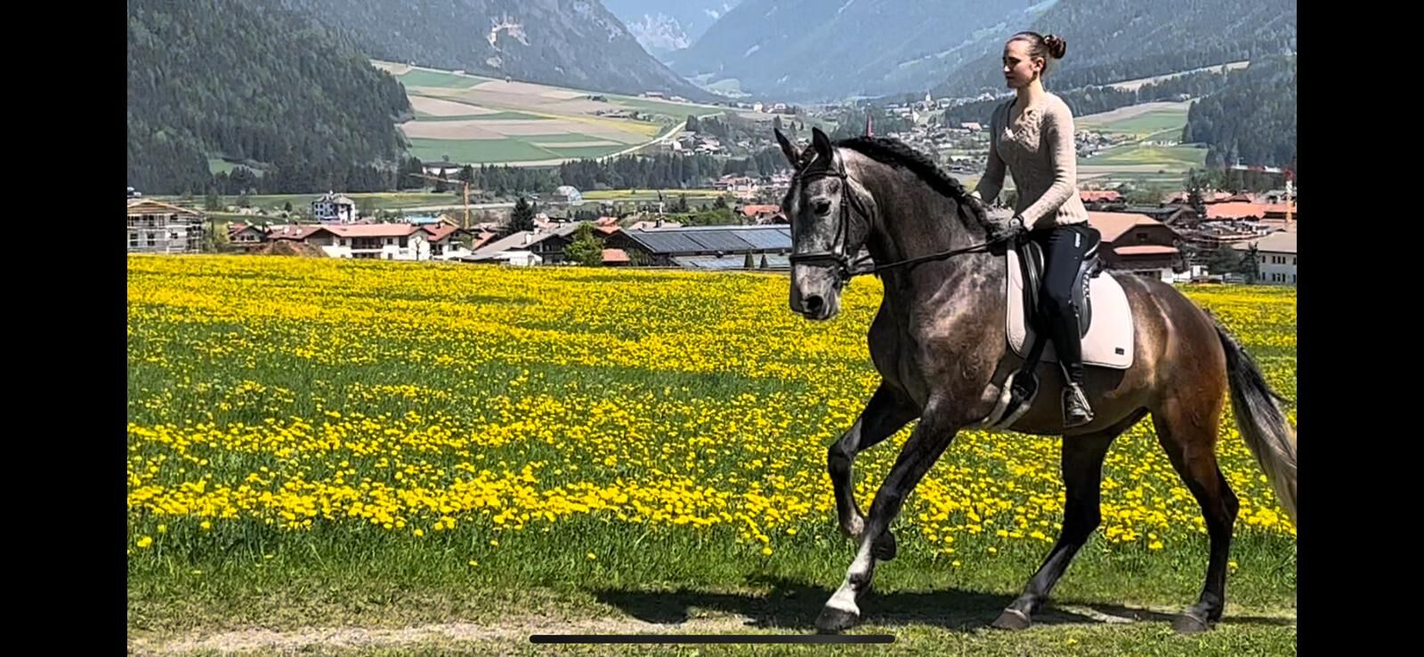 Udany 5-letni mieszaniec Lusitano - 5-letni mieszaniec Lusitano (Cruzado), 1,70 m wysokości w kłębie, wyhodowany w Hiszpanii, trafił do mnie 1,5 roku temu, został wykołysany i łagodnie zajeżdżony. Od tego czasu jest regularnie trenowany, ma 3 dobre chody. Bez problemu biega boso. To nie jest koń dla początkujących, on chce być ujeżdżany. Cartayero lubi jazdę w terenie, nie ma problemu z traktorami, ciężarówkami i rowerami. Doskonale nadaje się do stada, w swojej grupie ma niską rangę, w dzień stoi na dworze, a w nocy w boksie. Dostępne paszporty dla koni, regularnie odrobaczane, szczepione i czyszczone zęby. Można przesyłać filmy wideo.