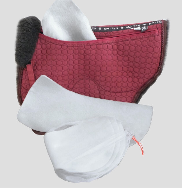 Uniwersalna podkładka pod siodło Mattes "Leisure" (panel hiszpański) - Sprzedam podkładkę pod siodło ze skóry jagnięcej Mattes w rozmiarze uM 53 cm. Mój warmblood nosił to i rozmiar jest rzeczywiście WB. W komplecie wkładki korekcyjne (po 3 z każdej strony). Jest w bardzo dobrym i zadbanym stanie i nie ma żadnych uszkodzeń. Sierść jest miękka i dobrze wyszczotkowana (nie matowa). Cena zakupu wyniosła 360 CHF.