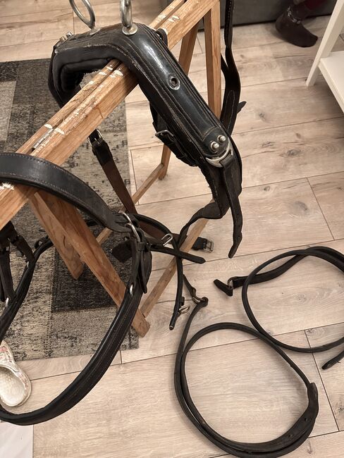 Uprząż do jazdy na kucyku - Uprząż do jazdy w rozmiarze dla kuców. Brakuje pierścienia do linek do jazdy, ale można go wymienić przy odrobinie zręczności manualnej. Ponieważ uprząż wisiała przez jakiś czas (jest na to zbyt zła), skóra jest nieco sztywna, wszystkie sprzączki i skórzane paski są nienaruszone. Nakrycie głowy i smycze nie wchodzą w skład zestawu.