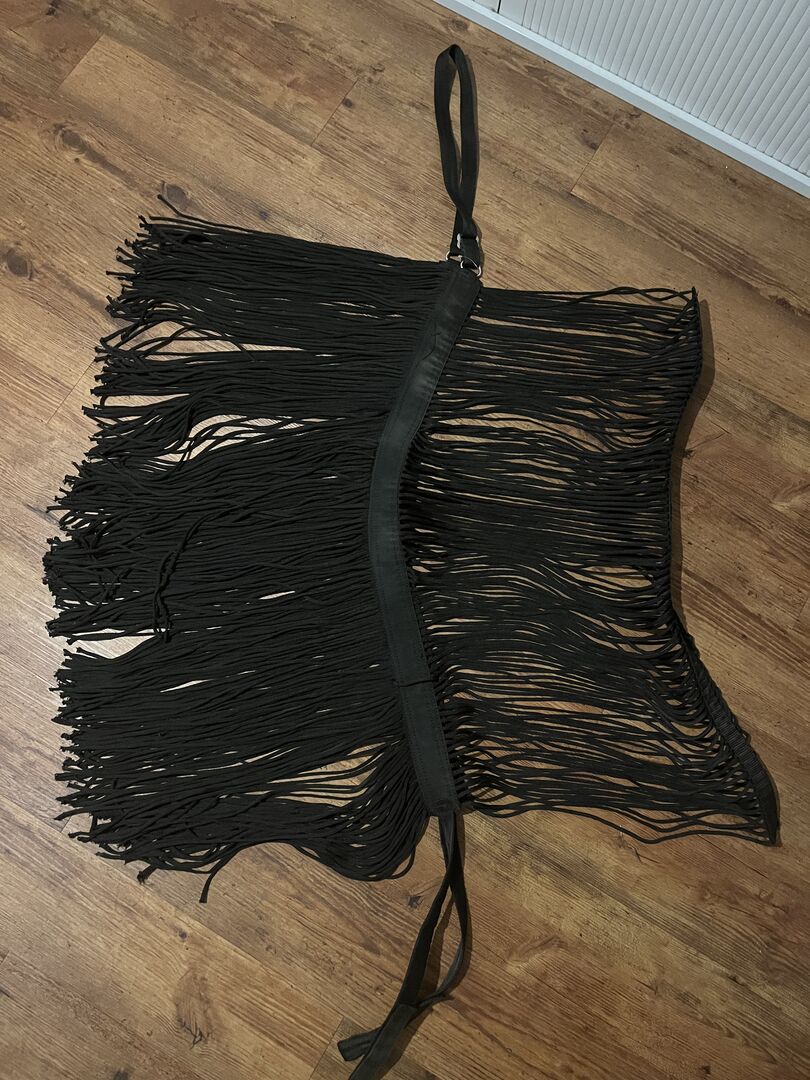 Uprząż muchowa - Uprząż chroniąca przed muchami od Showmaster. Do przytulnych przejażdżek w sezonie muchowym. Łatwe do przymocowania do siodła/ popręgu za pomocą rzepów. Pasek pod potnikiem dla dodatkowego zabezpieczenia. Rozmiar F (warmblood) Przymierzony tylko raz, niestety nie był używany, zanim mój kolega stał się nie do jazdy.