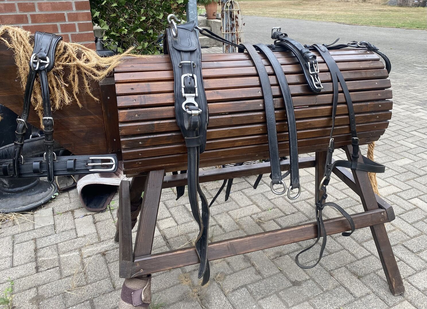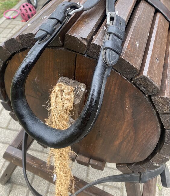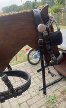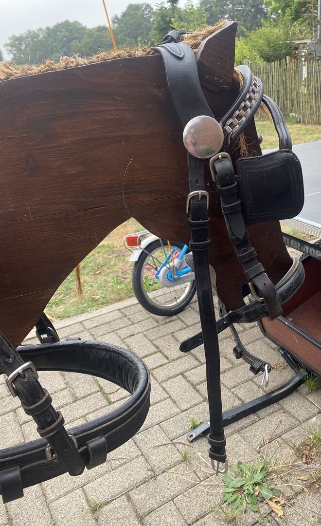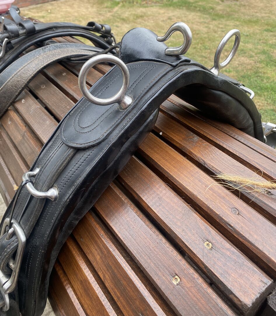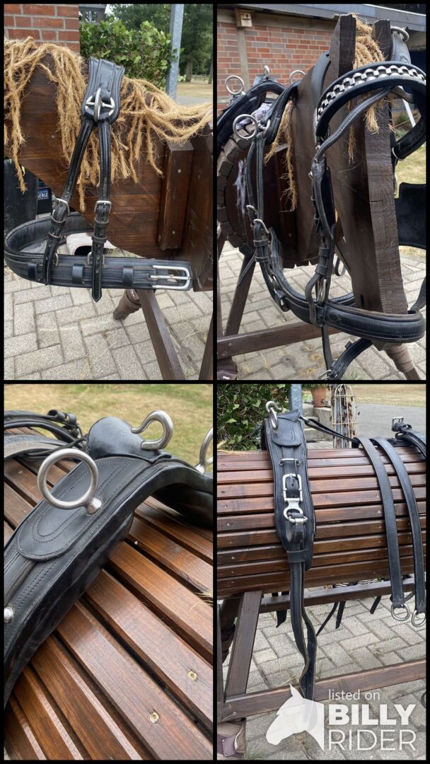 Uprząż napierśnika na sprzedaż - Na sprzedaż uprząż napierśna dla kucyków. Pasuje zarówno na mojego pełnowymiarowego kuca, jak i na kuca 1,38 m. Uprząż jest w dobrym stanie, z normalnymi śladami użytkowania.