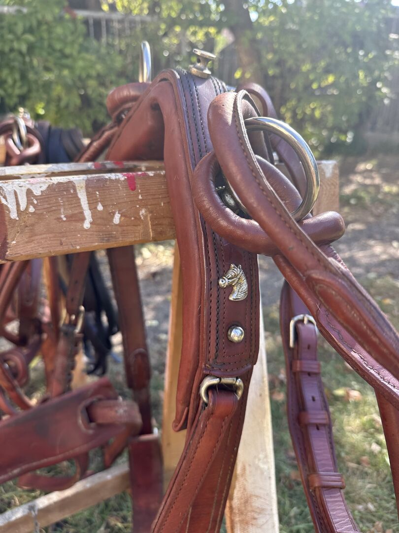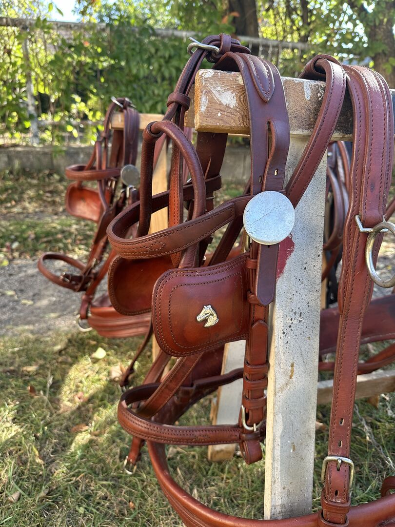 Uprząż z napierśnikiem dla dwóch koni - Sprzedajemy naszą używaną, ale bardzo dobrze utrzymaną uprząż z dwoma liśćmi piersi, w tym smycze Achenbach.