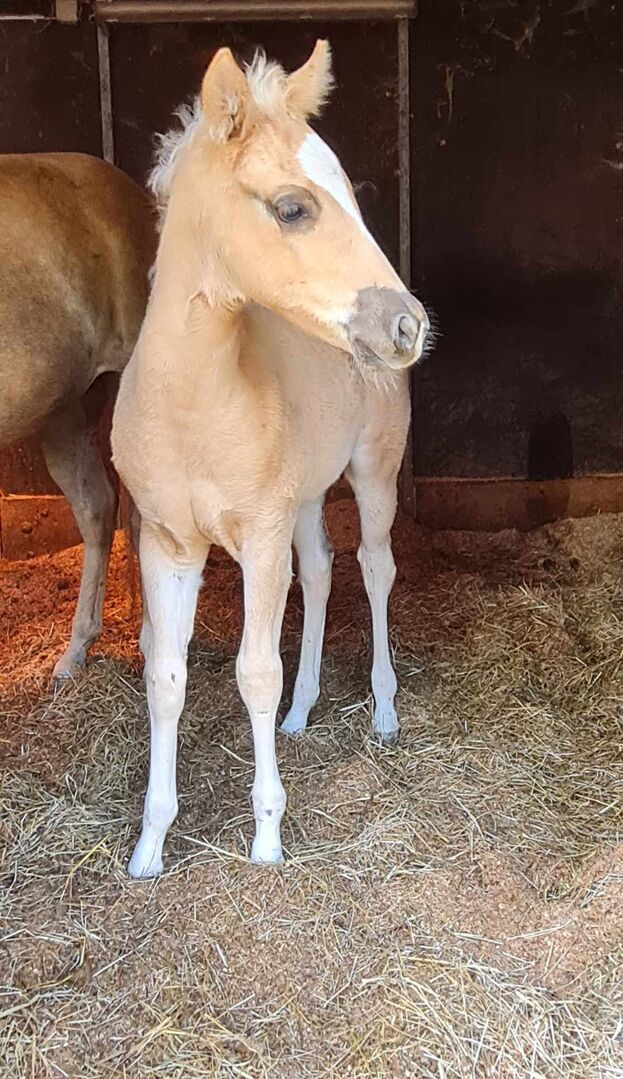 Urocza klaczka rasy paint horse w wymarzonym kolorze - Lokalizacja: 76703 Kraichtal LV Raven Whiz Gun - silna, piękna klaczka rasy Paint Horse, urodzona w wieku 2,25 lat, o szacowanym wzroście 152 cm, szuka wymarzonego domu. Ta mała osobowość przekonuje swoim wspaniałym umaszczeniem - Palomino lub Dark Palomino i prawidłową budową. Wciąż jest trochę nieśmiała z charakteru i nadal potrzebuje trochę przekonywania. Ale z każdym dniem jest coraz lepiej. Pozwala się pielęgnować i daje kopyta. Pracujemy nad jej prowadzeniem na halterze i będzie znała źrebięce ABC, gdy zostanie przekazana. Jest przyzwyczajona do psów i dzieci, a także traktorów i pojazdów budowlanych. Dorasta w stadzie i jest 5-panelowa n/n po rodzicach. Mała ma dobry rodowód reiningowy. W swoim rodowodzie ma wiele znakomitości reiningowych, takich jak Colonels Smoking Gun, Topsail Whiz, Peppy San Especial i Gatling Gun. Świetny młody koń, zarówno do jazdy rekreacyjnej, jak i jako czworonożny towarzysz zawodów.