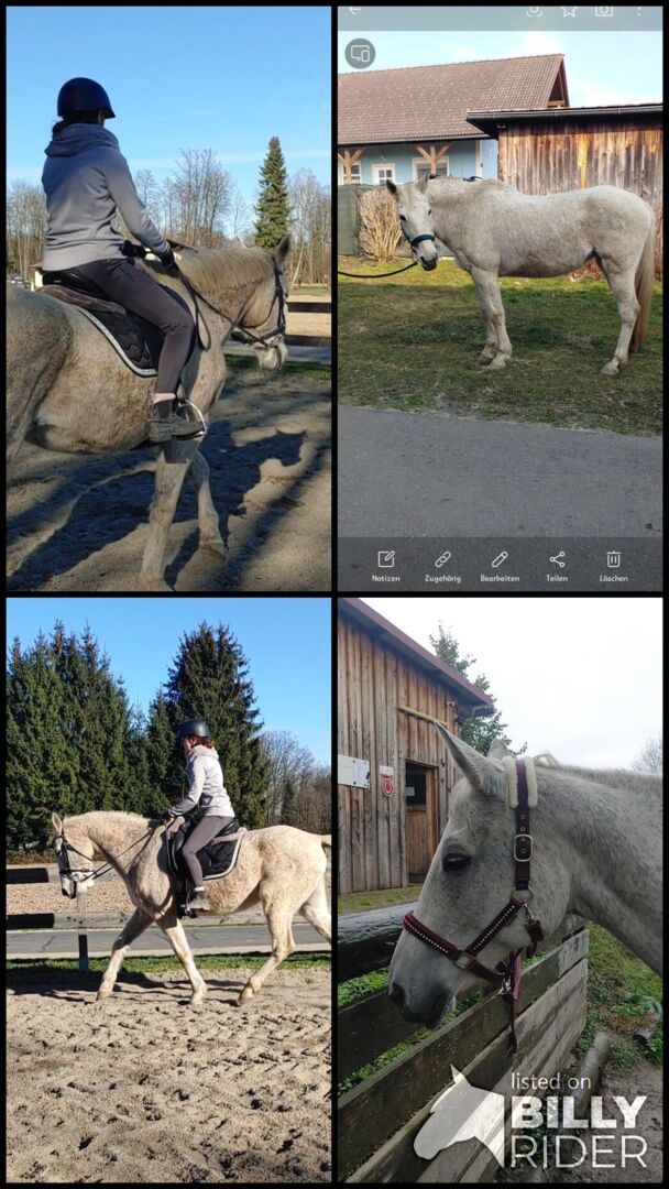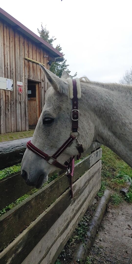 Urocza siwa klacz - Szukam nowego domu dla Suki, mojej bardzo przyjaznej, spokojnej siwej klaczy, ponieważ moje pozostałe dwa konie (islandzki i Shetty) nie pasują do niej ze względu na jej dzikszą, bardziej zabawową naturę. Suki nie jest zadowolona z tej sytuacji. Suki trafiła do nas przed Shetty, ponieważ musiałam zabrać mojego konia islandzkiego do domu (około rok temu) z powodu alergii na siano. Suki powinna być dobrym przyjacielem dla mojego konia islandzkiego i koniem rekreacyjnym/skokowym dla mnie, ale te dwa konie zupełnie do siebie nie pasują. Suki musiałaby zostać ponownie wyszkolona (ponieważ nie jest dobrze umięśniona z powodu złej hodowli przez poprzedniego właściciela, a ja nie mam czasu na kontynuowanie treningu i budowanie jej) lub, jeśli nie mogę z nią tak dużo pracować, mógłbym ją sobie wyobrazić jako konia towarzyszącego z koniem, który bardziej jej odpowiada pod względem charakteru. Suki jest zawsze dobrze wychowana, nie płochliwa, na początku trochę powściągliwa w stosunku do nowych ludzi, nigdy się nie złości, stoi na stanowisku pielęgnacyjnym jak skała, dobrze podaje kopyta, nie jest płochliwa w stosunku do innych zwierząt, samochodów i traktorów. Podczas jazdy konnej jest również dobrze wychowana, ale potrzebuje rutyny i bezpieczeństwa ze strony jeźdźca. Obecnie jest trzymana w otwartym boksie, ale z pewnością czułaby się komfortowo również na padoku. Ponieważ bardzo ważna jest dla mnie poprawa sytuacji Suki, cena jest sprawą drugorzędną i podlega negocjacji.