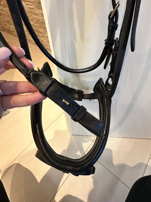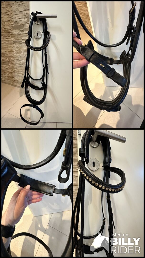 Uzda ma następujące cechy: - Sprzączka na szyi dla optymalnego komfortu - Miękka wyściółka na naczółku - Opaska na nos o opatentowanym wyglądzie - Złote sprzączki jako eleganckie detale - Bardzo ciemnobrązowa skóra o klasycznym wyglądzie