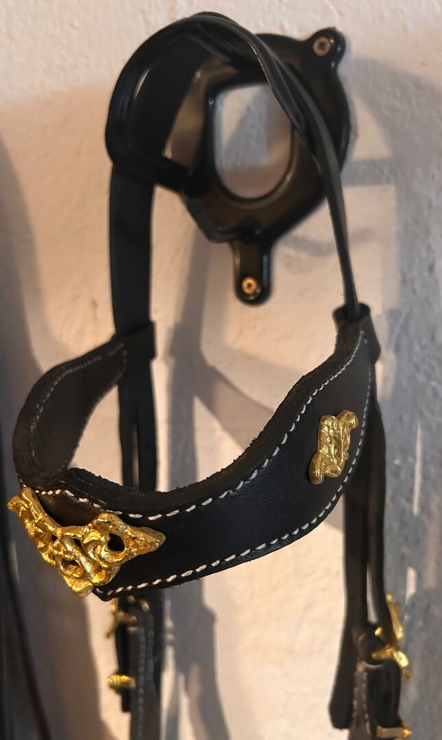 Uzda barokowa - Bardzo piękna barokowa uzda wykonana z bardzo miękkiej skóry, czarna, złota z białymi ozdobnymi przeszyciami. Barokowe sprzączki. W komplecie 1 para wędzideł. Dla koni z wąskim czołem (!) i długą głową.