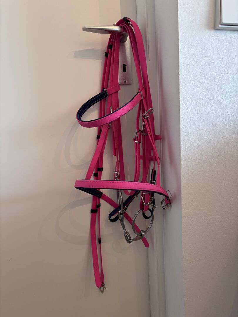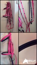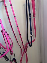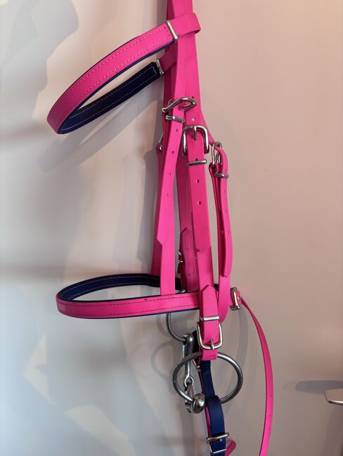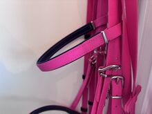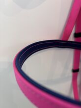 Uzda biotanowa, lejce i martingale w kolorze różowym - Snaffle biothane (100€) - bez końcówki - Angielska opaska na nos Kolor popręgu: magenta Kontrastowe szwy: granatowy/ciemnoniebieski Kolor opaski na nos i opaski na czoło (wewnątrz): Granatowy/ciemnoniebieski Rozmiar: Thoroughbred Szerokość: 16 mm Okucia: Srebrne
