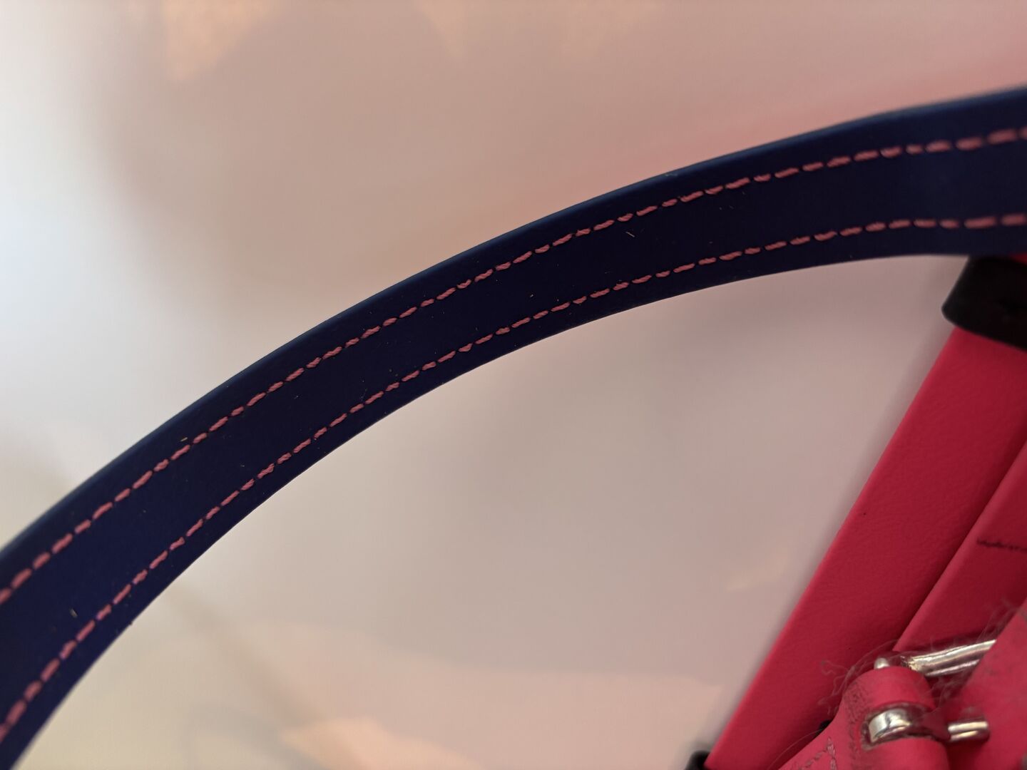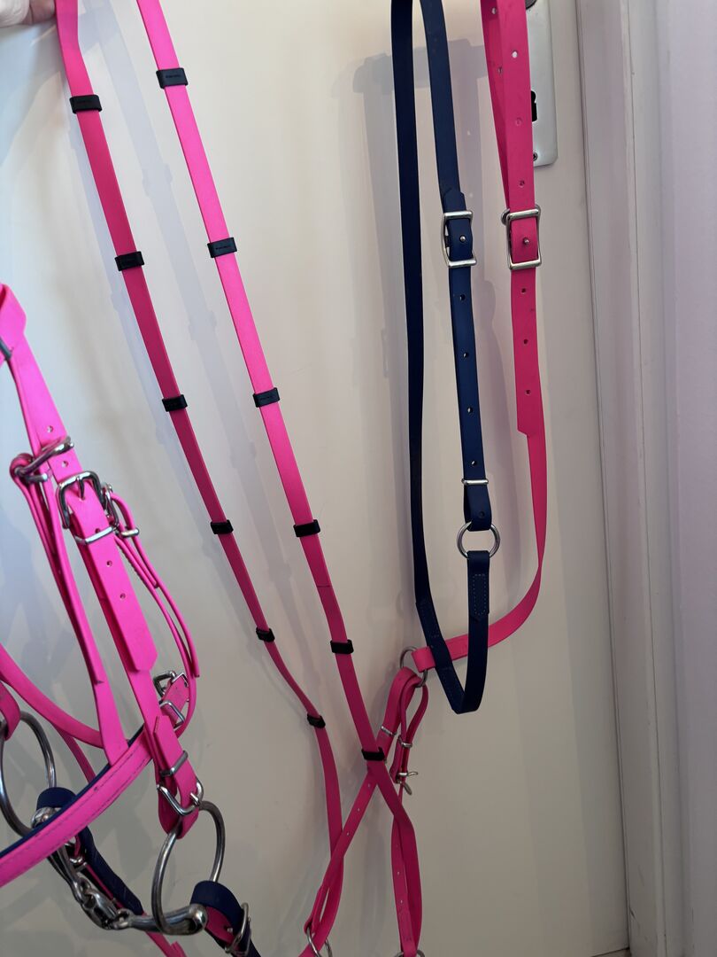 Martingale wykonane z biotanu (50€) Przymocowany do popręgu siodła za pomocą pętli Kolor podstawowy: magenta Kolor paska na szyję: Granatowy/ciemnoniebieski Rozmiar: Thoroughbred Okucia: Srebrny