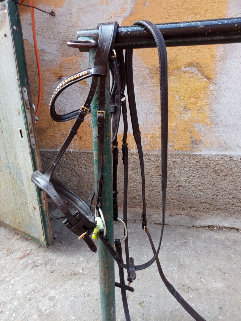 Ciemnobrązowa uzda, stan dobry, rozmiar Cob, szeroka, miękka część szyjna, cancel, noseband (angielski) miękki podkład, hak uzdy, sprzedaż ze szpicrutami.