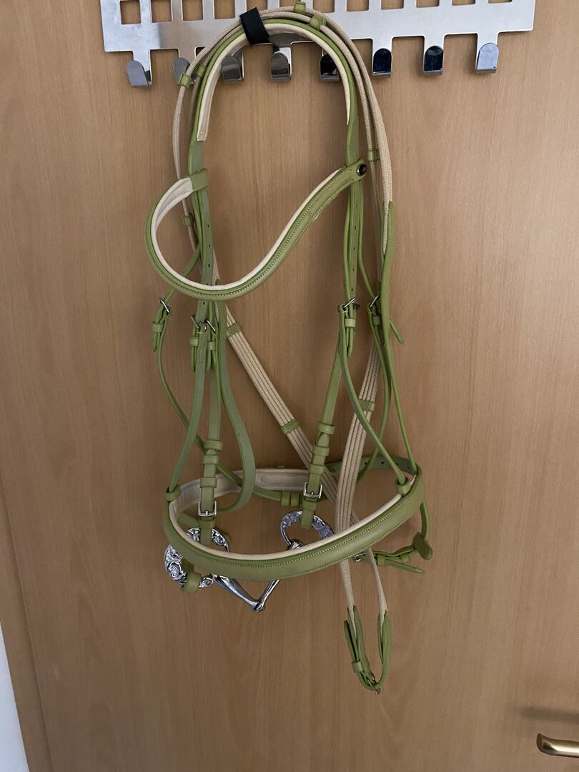 Uzda do jazdy konnej - Zielony snaffle marki Wembley Bardzo dobrze utrzymany niewielkie ślady użytkowania Możliwość sprzedaży z bitem lub bez (z bitem+8€ ) Możliwość wysyłki za dodatkową opłatą!