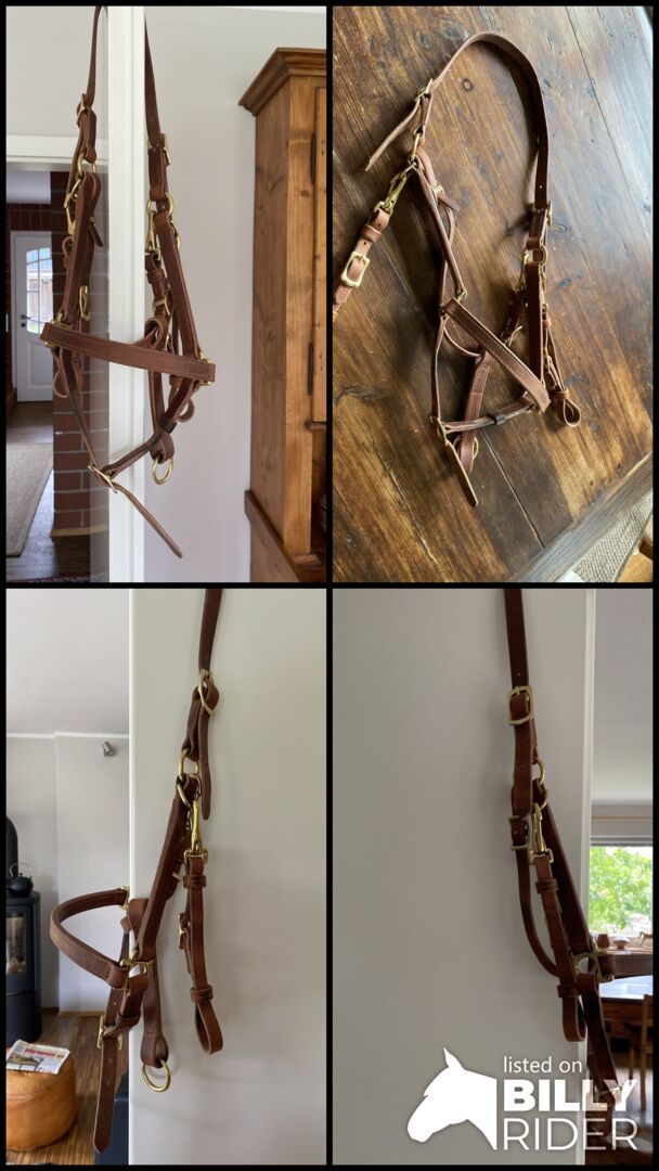 Uzda do jazdy terenowej - Ta podróżna uzda wykonana z uprzęży z mosiężnymi okuciami pasuje do dużej głowy konia islandzkiego i nadal ma miejsce na zwiększenie rozmiaru. Nie byłem w stanie używać uzdy - jest nowa i była tylko na koniu, aby ją wypróbować.